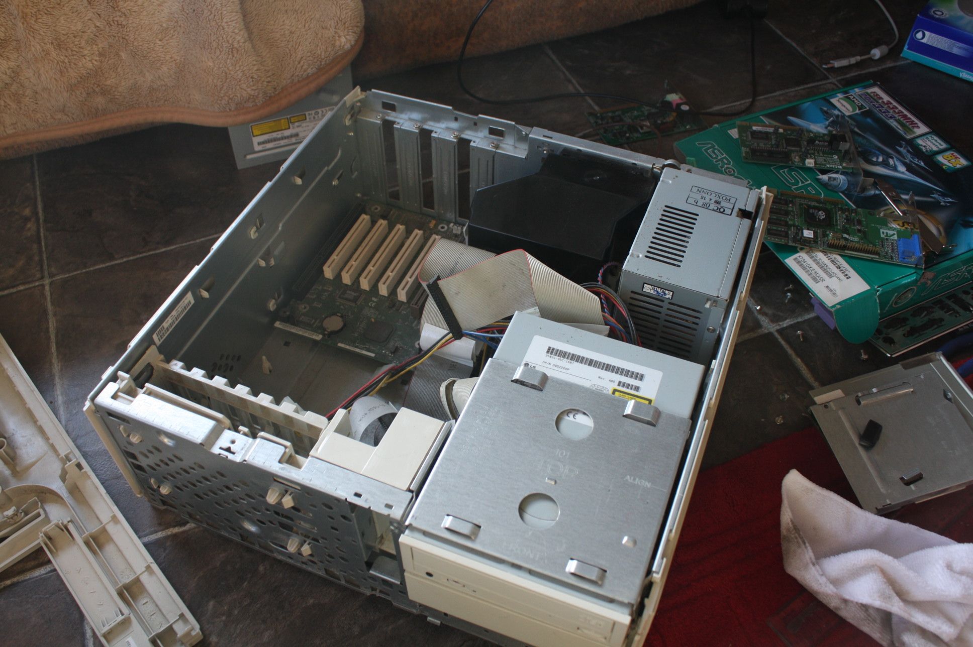 Getting the case open was much easier than I initially thought it would be – only an unusual thumb screw and a couple of case clips stood in my way. Old computers don’t agree with me most of the time, thanks to the insane amount of dust they hoard over their lifetimes. Thankfully the workplace it came from was non-smoking so there was no cigarette stench or staining, which is one of the worst things when dealing with smokers computers. Not only are the computers contaminated, as soon as the fans begin to spin they cover the surrounding area too. After a lot of hoovering and dusting I was able to disassemble everything. This is an old computer, and as you can see from the motherboard with it’s ISA slot (big brown) alongside the regular PCI slots (smaller cream), it was from the period when ISA was being phased out in favour of PCI as an expansion slot. I think this computer had a different type of RAM too, but I’m not entirely sure (PC100 RIMM as far as I’m aware). Note the big cover for the CPU heatsink to draw the air over the processor and out an exhaust fan, which is one of the reasons the computer is so quiet.