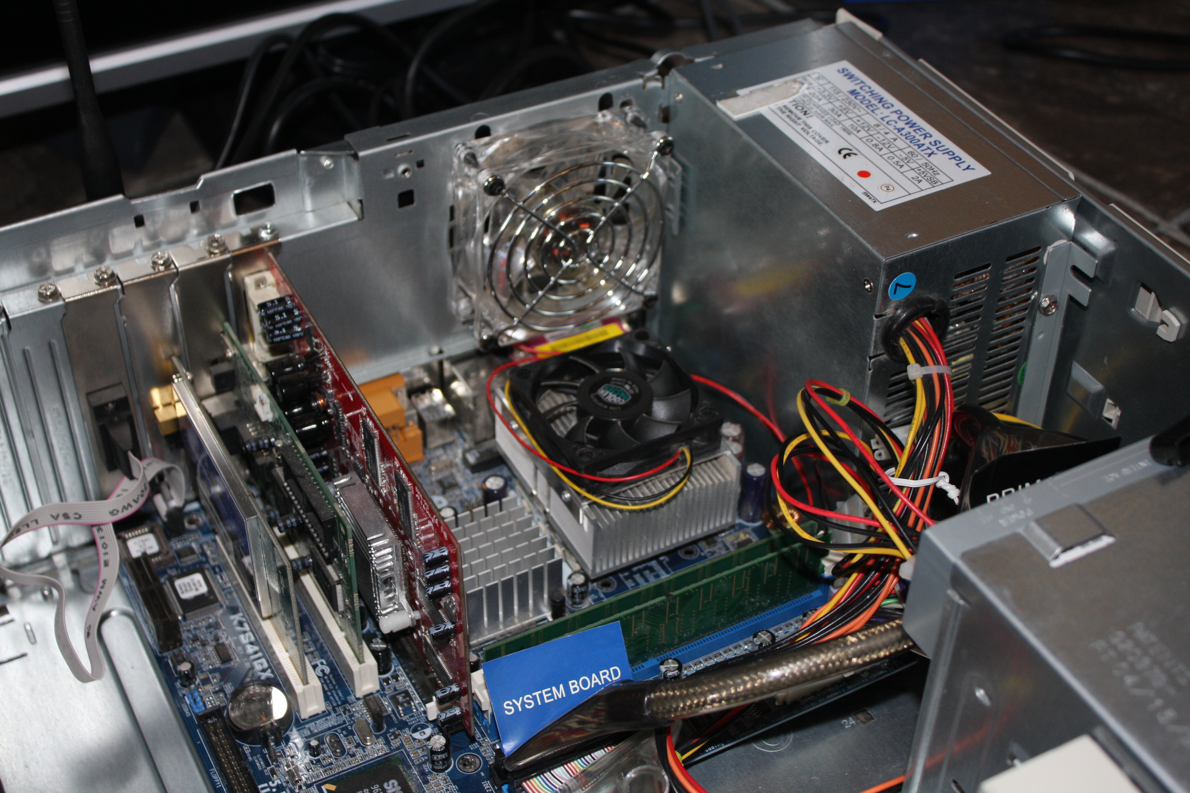 Skipping forward, the finished system is now equipped with a Radeon 9550 graphics card, a Linksys WiFi card, a spare network card, 1 Gb RAM and an Athlon XP 2400+. It can cope with most video up to about 720p resolution. I replaced the old chassis fan with a blue LED one I had lying about, so hopefully everything should be kept cool and quiet.
