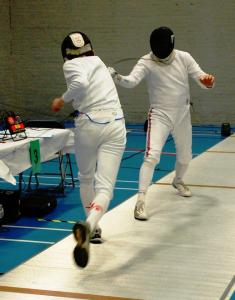 Yes, I am now equipped to duel with my new rapier! It’s strange, but I always imagine swords as elegant, light weapons, whereas the reality is that they are heavy monsters. Even the rapier, one of the lightest swords, is hefty enough. I can’t imagine having to fence with it for any amount of time. The main reason I was interested in getting my hands on one was because it is the ancestor of the épée I fence with normally, though it has changed significantly in the process of becoming a sport weapon. My particular rapier is an English swept hilt type, and sharpened at the tip but not the sides, as it is primarily a thrusting weapon. As a training weapon, it would actually be pretty excellent. If you could get used to the weight of the real sword, holding an épée after an intense bout of fencing would never phase you again. On another fencing note, I’ve managed to find the only picture of me fencing in existence, as far as I’m aware. And it’s actually quite a good one at that. It was taken at the NI Open back in January, and I didn’t even realise anyone was taking photos, but it was posted on the Irish Fencing Federation’s facebook page which I just happened to be perusing for ranking information. I’m not aware at all of what I’m doing when I’m fencing, and by that I don’t mean that I can’t fence, but that I’m not aware of what I actually look like or what my posture or positioning is whilst I’m fencing, as you can tell from the photo on the left. Still, I’m quite happy I got the point – right to the neck! I only go for kill shots of course…but not really. The best target is the wrist/arm, left over from the time when you would duel to first blood, and a nick to the wrist was the quickest and cleanest way to beat your opponent.