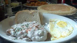 The Stepping Stone Café was the other featured location we visited, which was a bit farther out from the town centre, but thanks to Google Maps public transport directions we were able to navigate the street car system with relative ease. This café is home to the mancake, a plate sized pancake which can be ordered in a stack of three for the insane among you. The prices were all really reasonable, and I ended up going for chicken fried steak with sausage gravy, fried eggs, and a mancake on the side. I love America.