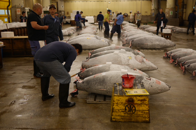 After drifting in and out of consciousness, wedged against a wall of the fish information centre (a literal tourist trap), we were let loose on the market. I use the term loose rather loosely, as it felt more like we were prisoners of war being marched to a camp rather than a tour through Tsukiji. The market was positively frantic with activity. Trucks flying about the place, little transporters almost running us over, and bikes everywhere in between. For the fishermen and other workers it was business as usual, and we were an inconvenience, holding up proceedings. Not that we had much opportunity to – stopping for photos was not an option, as screaming security guards promptly informed us. Following a long and perilous walk, we were guided through a set of doors and into the narrow tourist viewing area in preparation for the auctions. The first thing that hit me was the cold. The place was freezing, but it was easy to see why. All around were huge frozen tuna fishes, and crates of other tuna cuts. Potential buyers walked from fish to fish, testing them with picks, and trying to pick out the best specimens.