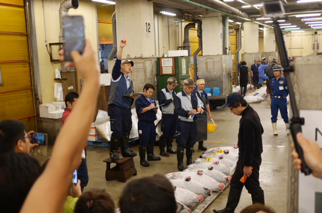 The auctioneer began to ring a hand bell in an elaborate fashion, and the auction began. I had no idea what was going on from this point – auctioneers are hard enough to understand in English, let alone Japanese. It was worth the wait to see the chaos of the market, and to see the tuna up close, but I was slightly underwhelmed by the auction itself.