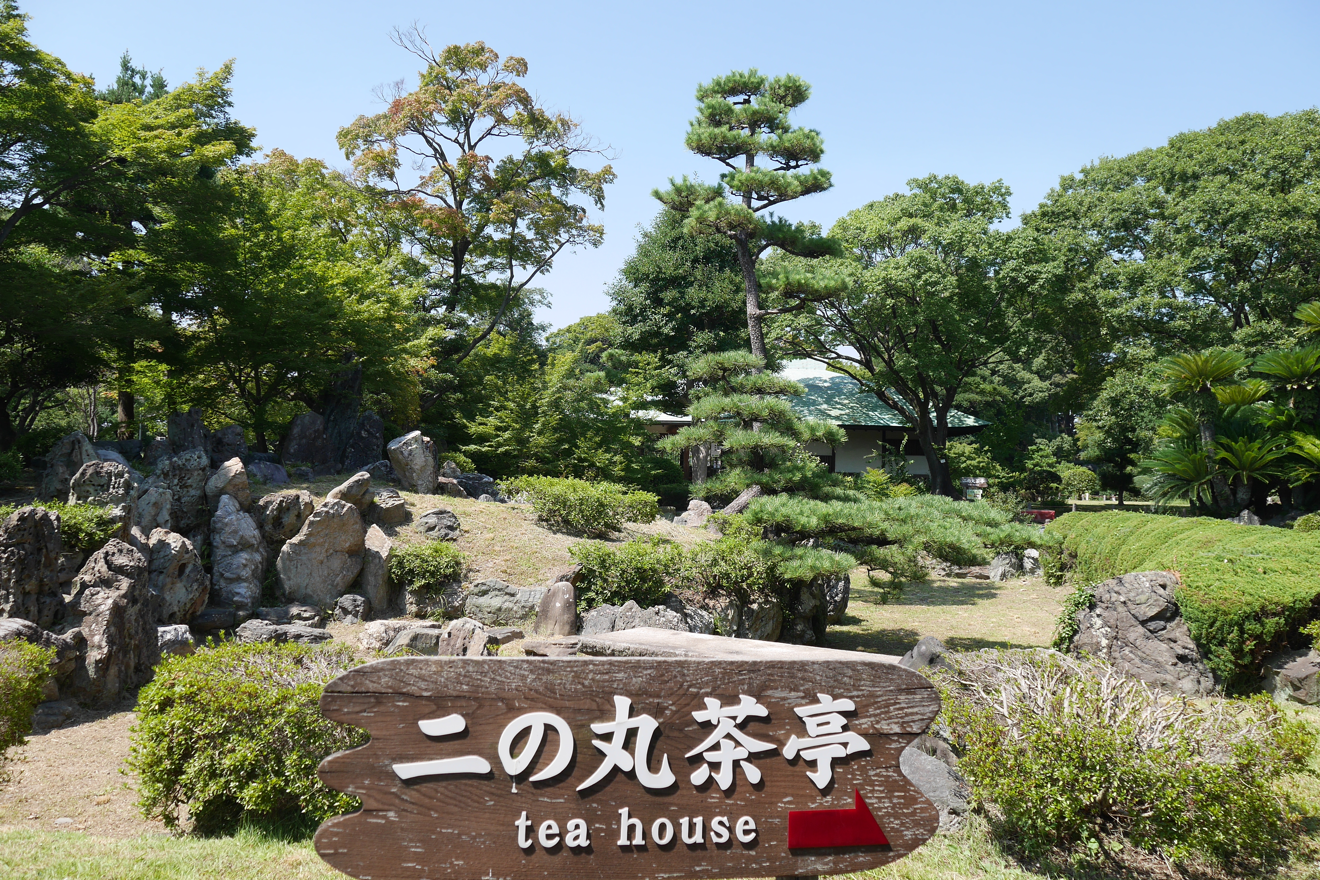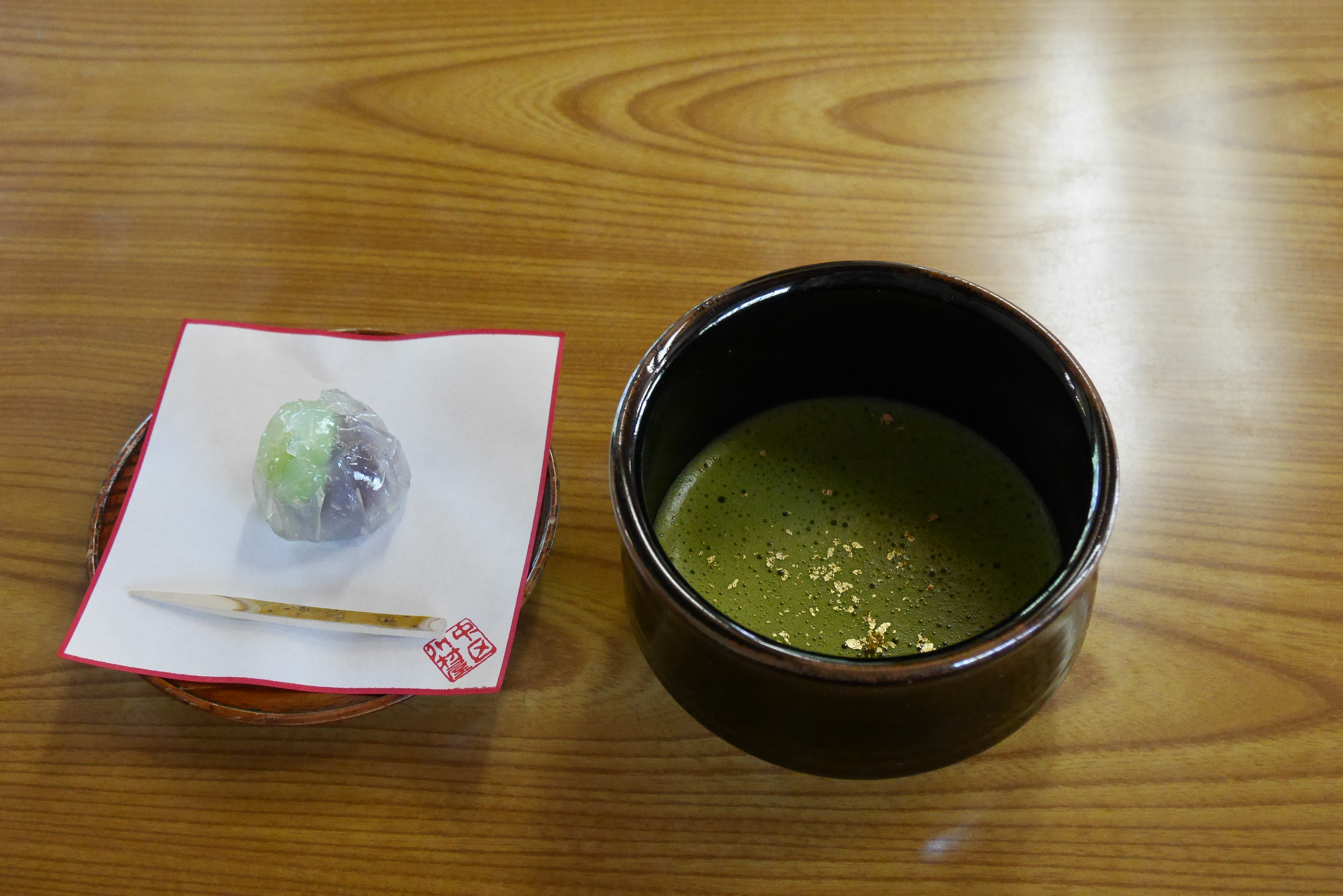 I spent a little while exploring the gardens around the castle, battling through the heat of the day. I wanted to get in somewhere shaded where I could relax for a little while. I was making my way to the exit when I came across a sign for the garden tea room house. That was exactly what I was looking for! These tea houses serve traditional Japanese sweets along with matcha, in an authentic setting. I had been to one in Hama-Rikyu gardens in Tokyo with my Japanese host, so I knew what I was getting myself into, and the rules of the game. Eat the sweet first, place the matcha bowl in your left palm with your right hand, rotate the bowl twice clockwise, and drink. I’m a sucker for specials, and this particular tea room had matcha with gold leaf. It didn’t add anything to the taste, but it was a nice touch. I forgot to ask for iced matcha though, and received a cup of hot tea on an even hotter day. It was still good though, and I had the tea room to myself for most of the time.