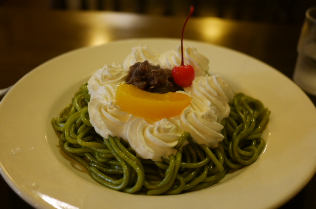 My food quest didn’t end there, it had only begun. I had come to trust the recommendations of Teru, one of the researchers in the lab, as he sent me to a fantastic ramen place serving Kyoto style noodles in a thick pork based soup (tonkotsu). The next suggestion he made was “matchasta”, or matcha (green tea) spaghetti, at Café Mountain. It just so happened to be that Café Mountain was relatively close to where I was staying, so I had planned to visit it for some time. I don’t know what I expected, but there should have been a clue in the name of the joint. I ordered the amakuchi matcha ogura spa, and a mountain of green spaghetti arrived, topped with whipped cream, red bean paste (anko), a cherry and a slice of peach. It started off great, and the combination of the red bean paste, cream, fruit, and pasta went together really well. It wasn’t long before the sickly sweetness got to me though, and with only a small amount of fruit to cut through it, it almost made me sick. By the end it was just sweet spaghetti and cream and I was really struggling to finish it. As a novelty and in a small quantity, I rather enjoyed it, but having to finish a massive plate of the stuff was too much. It wasn’t cheap, either. Then there was the bike ride home. Cycling on an incredibly full stomach is never good news, but I made it back, safe in the knowledge that I would never have to eat that again.