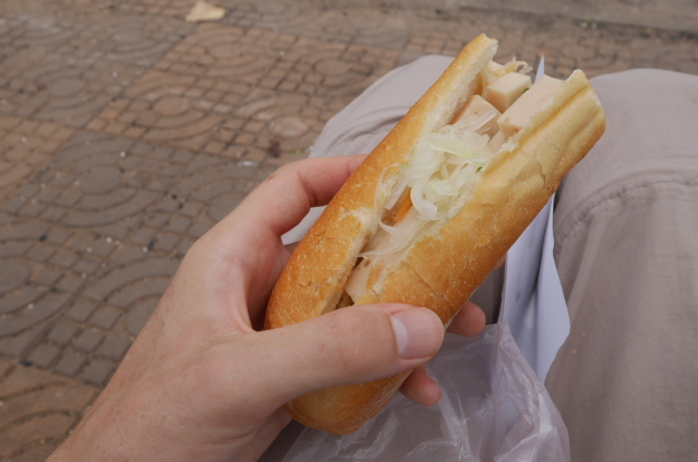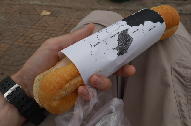The twenty-ish minute stop for lunch was uneventful. The bus pulled up at a restaurant with rip-off prices (probably part of a deal, with cash for the drivers), but I went walking in the opposite direction, looking for street food. The street food here has been generally of much lower quality and less appealing looking than in Seoul. I know it’s hard to compare the two places, but Seoul’s street food was the best this trip, and most things I had were delicious. I found a few stalls selling questionable, unidentifiable foodstuffs then gravitated towards a baguette stand. The French colonist influence still lingers in some of the food, though the filling was not quite as…European. The guy didn’t speak English at all, so had no idea what I was asking. First he spread some creamy yellow stuff, followed by a smattering of brown-ish mashed things. Next came some red oily stuff, topped off with sliced cucumbers and spongy cheese/tofu/pork/fish/despair. Take your pick. Then he filled a little bag with some sort of other salad and handed me them both. I handed over a dollar and was somewhat regretting the decision. We are extremely protected from the hardships of real life in the Western world. There are many layers of legislation, health and safety, and food hygiene engrained into (most of) us. None of these exist in Cambodia. Food sits out in stalls, and raw meat sits on counters, covered in flies, and in the sweltering heat with no refrigeration for entire days at a time. I suppose it is whatever your digestive system is used to, but given our clean water and meticulously clean food, that kind of treatment wouldn’t sit well with most of us. When in Rome, I guess.