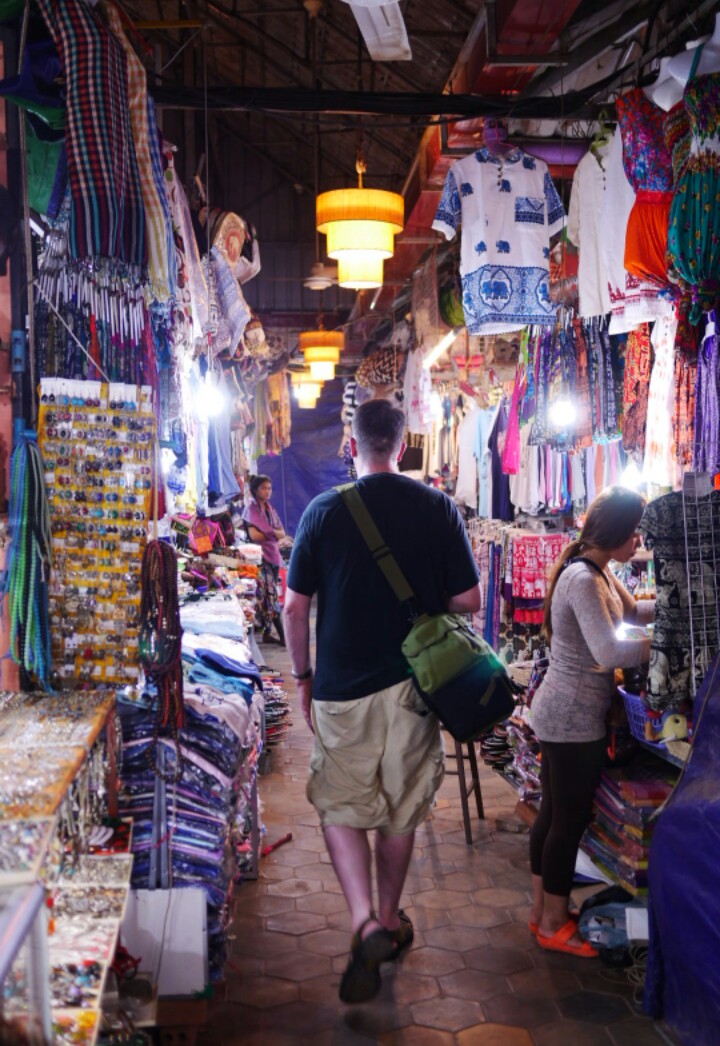The taxi from the airport to our hotel, the Shadow Angkor Residence, was only $7. Even with the driver’s best efforts to not get us there and bring us to a completely different hotel, Steven managed to get us there in one piece (minus the missing luggage). Our hotel is quite comfortable, if a little rough around the edges. Not at all like the grim places I stayed during my brief time in Osaka. As long as it’s reasonably clean, in a convenient location, and has WiFi then I’m more than happy. After unloading most of our stuff, we headed back out to the market heaven that is Siem Reap, clothes shopping with Steven. Some definitely genuine Colombia walking trousers for sale, and a few North Face and Jack Wolfskin bags. Whether they’re fakes (probable), seconds (less likely), or stolen from other tourists (hopefully not), it’s probably best to avoid them. They’re cheap, at the very least.