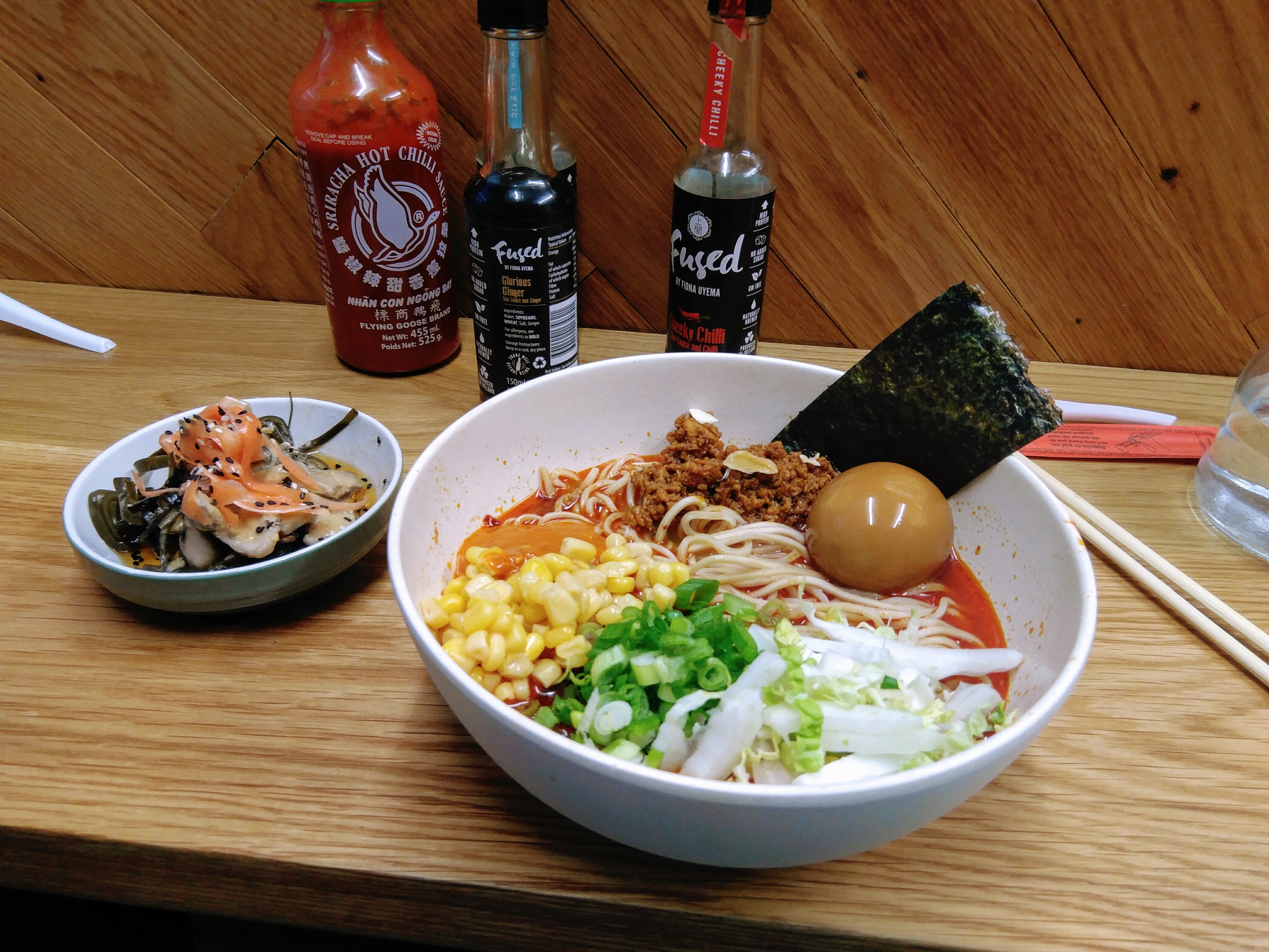 The shop was compact, with seats at the counter, and several at the window. There were only a few customers present when we arrived, so we had a chance to chat to Brian about his venture, and what he had been up to. A film crew had just been and gone for one project, and he’s also going to be talking at the TEDx Stormont Salon this year. We ordered two bowls of spicy ramen, and took our seats.