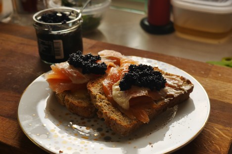 Wait, caviar?! What kind of upper class fantasy is this?! Not quite, as lumpfish caviar is about £3 a jar and not quite as decadent as the sturgeon/Beluga variety. Smoked scrambled eggs were also on the menu, for a bit of Christmas flourish.