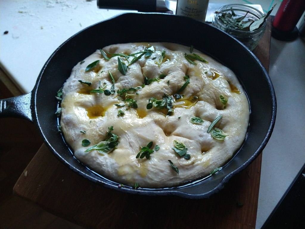 The culinary activities have not been limited to dehydrating. I mentioned before that I had started to use Ken Forkish’s book, Flour Water Salt Yeast, and a big part of his methods involve cooking in a Dutch oven to best simulate commercial bakery ovens. I owned nothing of the sort and merely fantasised in the past about having some Le Creuset cookware but thanks to the awesome power of industrial imitation, you can pick up a decent Dutch oven for £25 to £30 on Amazon. I bought a Villeroy & Boch one and it seems pretty solid for the money – enameled cast iron (I have a thing for cast iron.) I haven’t made a proper loaf in it yet but I did bake some of the dough I’d frozen from the last batch, and even that worked really well. A proper farmhouse loaf with a thick crust and perfect crumb. I used one of his recipes for making skillet foccacia with leftover dough too, which worked like a charm.