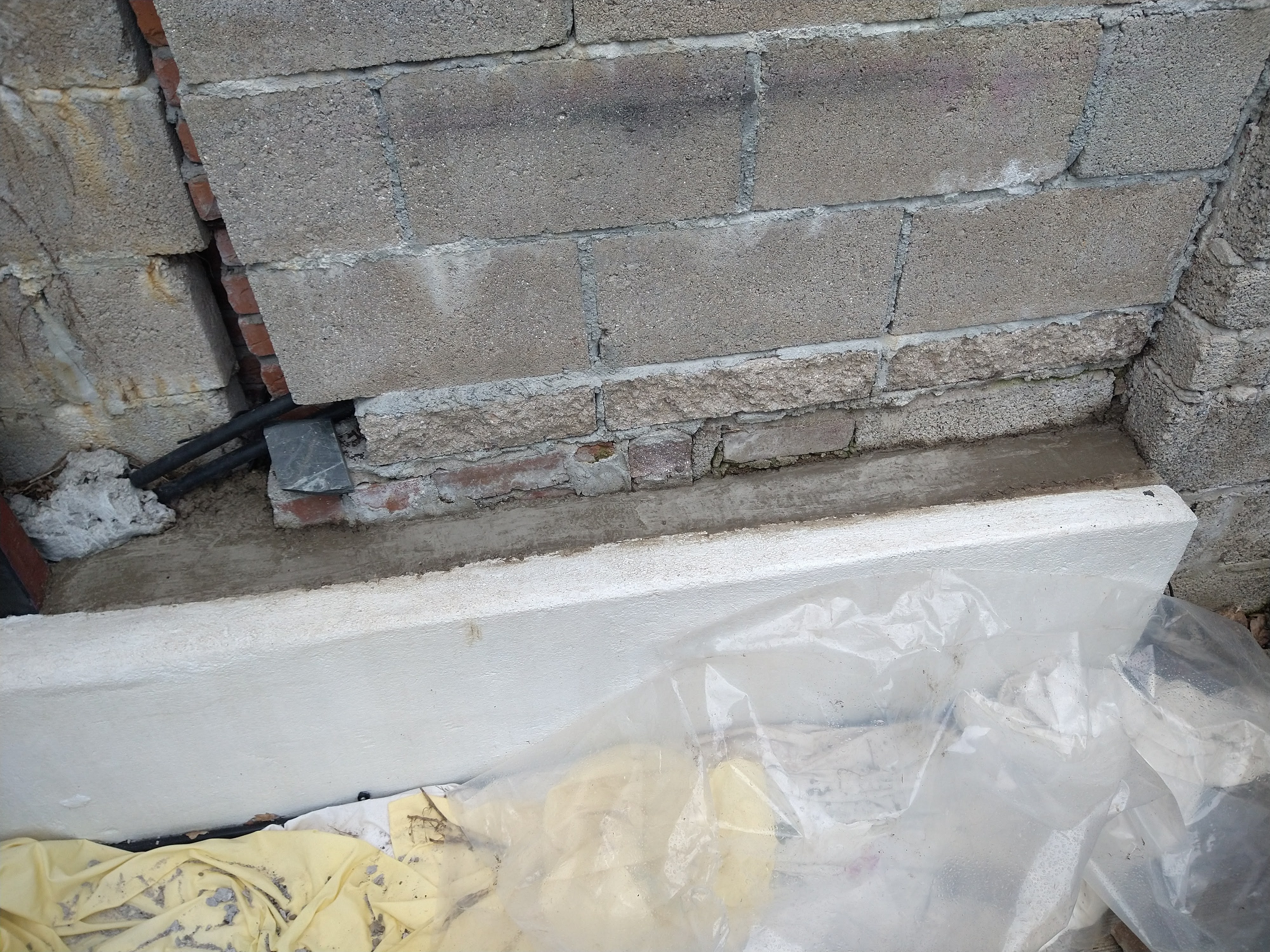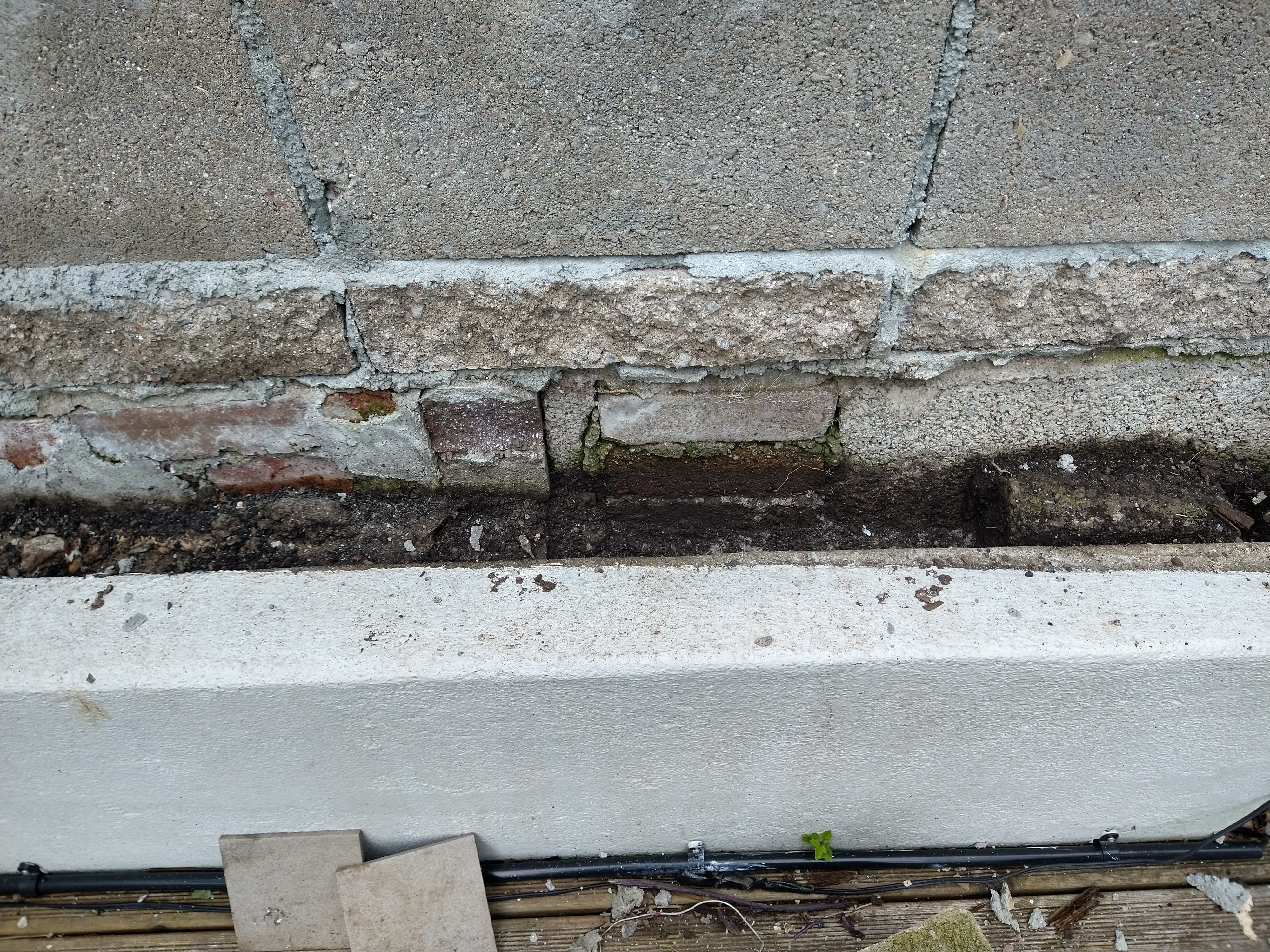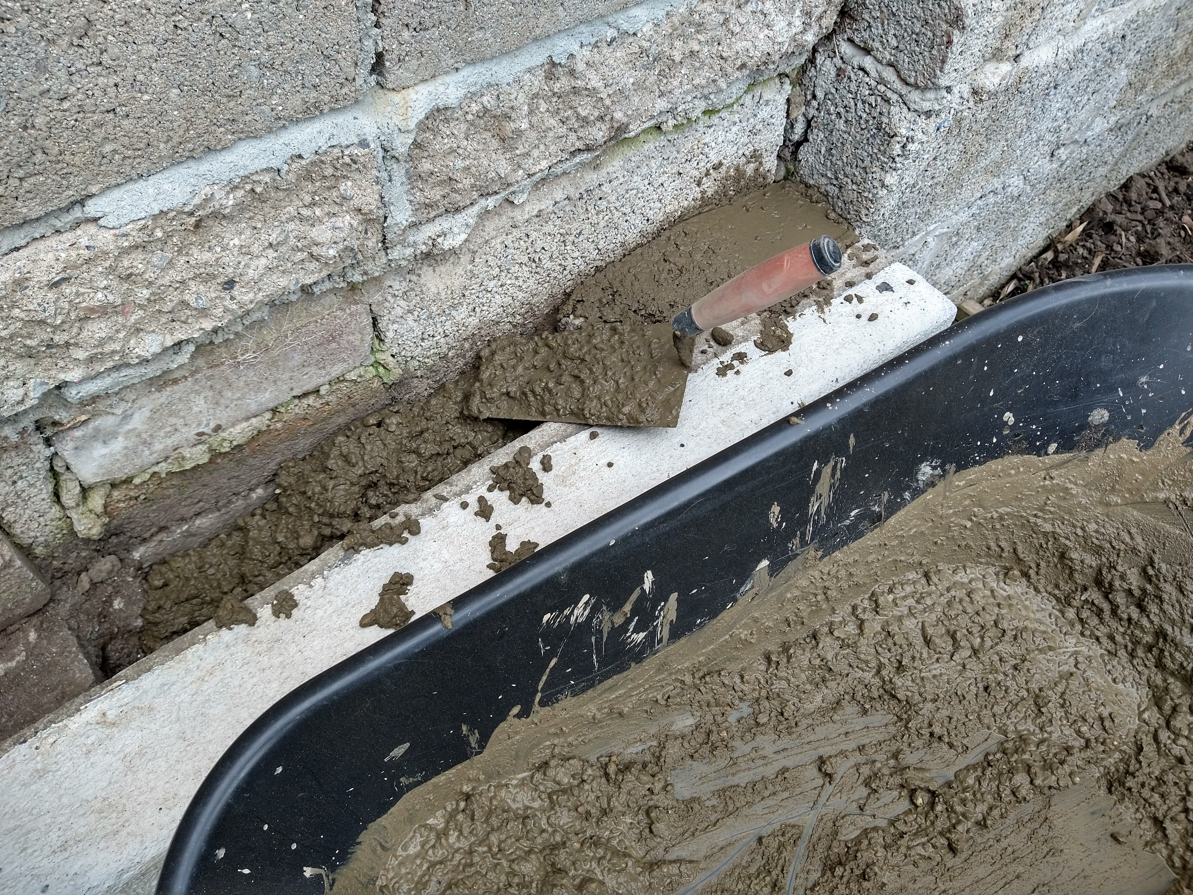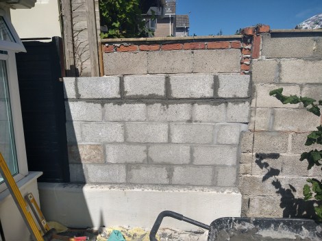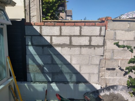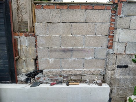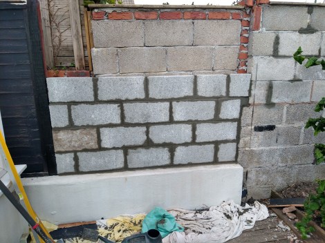 Things started to look a lot neater once I’d cut the errant brick and knocked the snots off. The foundation tidied it up considerably. Now to the bulk of the work. I was waiting for a stretch of decent weather so I could build the wall without the mortar getting too wet. There’s also a limit to how many courses (horizontal layers) of blocks you can lay in one go. In this case I laid four courses before giving up. Lay too many blocks at once and the mortar can be squashed out of the lower courses.
