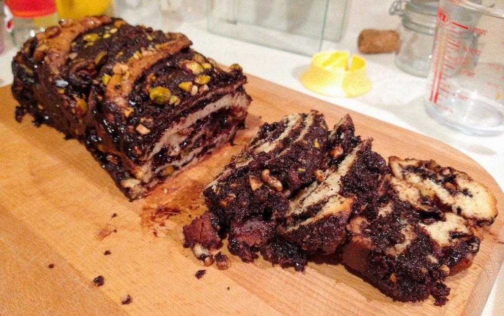The guts of the process are relatively simple. Make an enriched yeast dough (enriched referring to the addition of milk and butter). Roll it into a rectangle. Spread that rectangle with a melted combination of sugar, chocolate, butter and cocoa powder. Sprinkle with chopped nuts and roll up into a cylinder. Divide that cylinder in two, and make a two stranded braid. Squash the result into a loaf tin-size and leave to prove in the tin for an hour or two (till doubled approximately). Then bake at a higher temperature, and drop the temperature for the last stretch of cooking. Finish the whole thing with a sugar syrup glaze. I wasn’t holding out much hope after the early filling disaster, but the end result was rather excellent and something I’d happily try again.