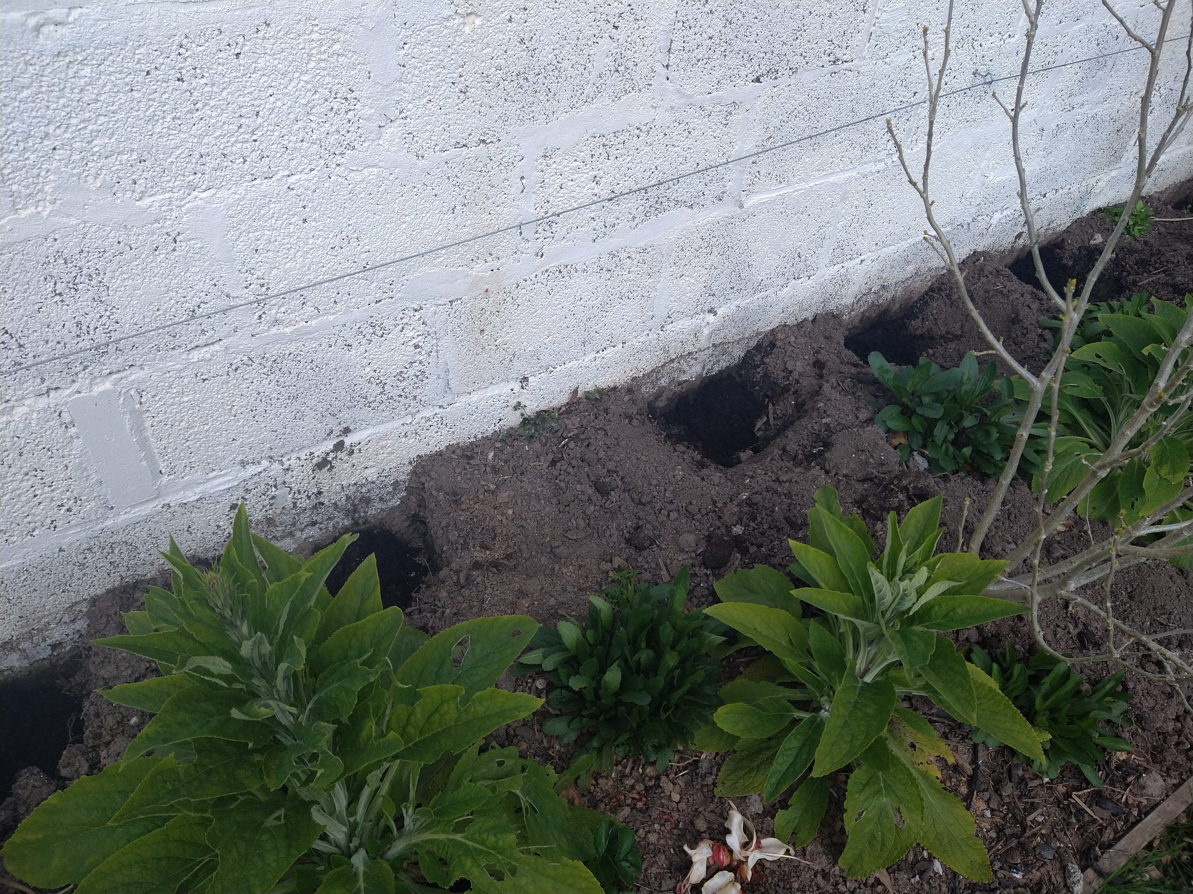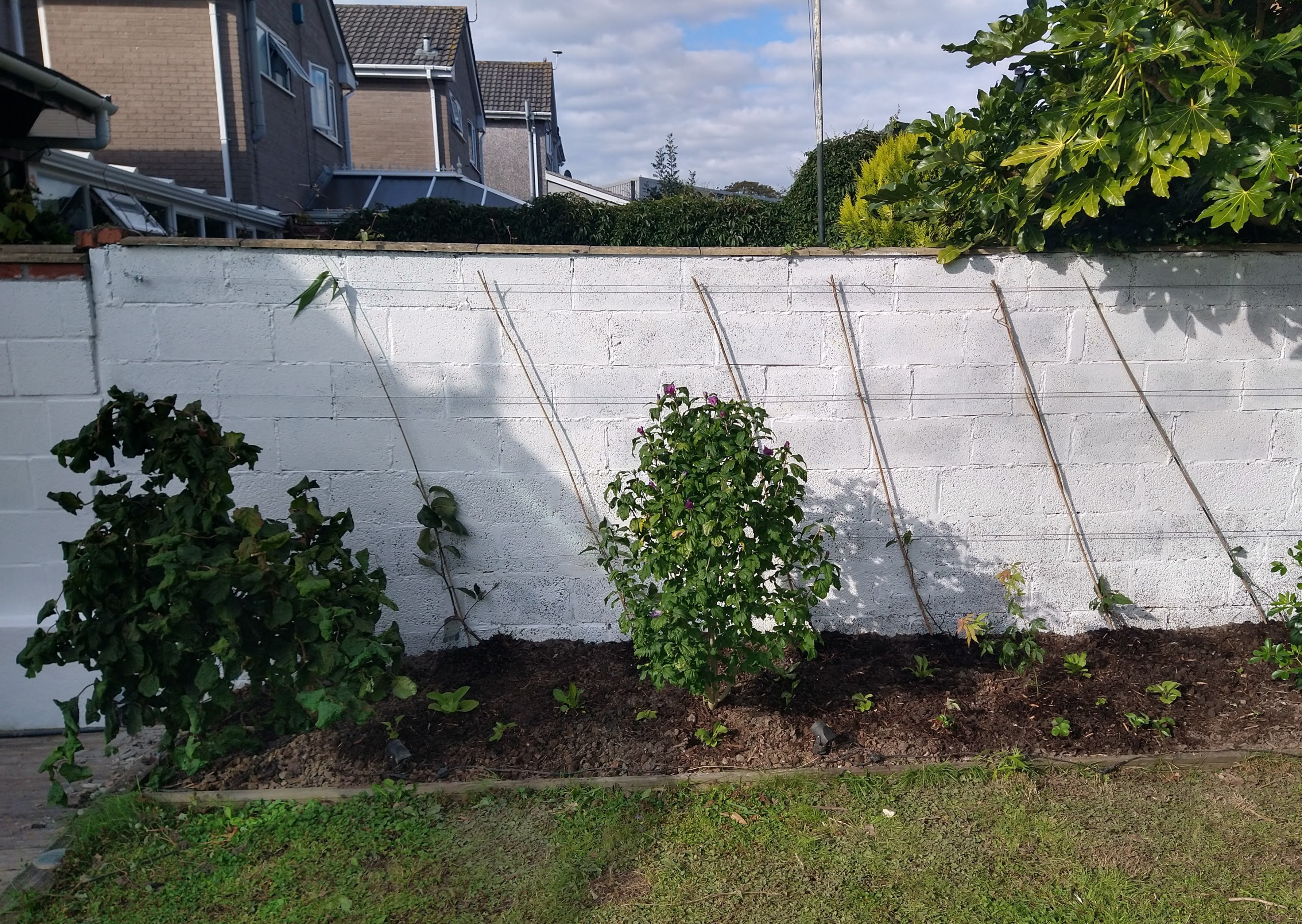 The bamboo canes I was using as supports on the initial cordon were not substantial enough, and on top of that they had started to grow again, so out with the old and in with the new heavier duty stakes. I tried to stick to 45 degree planting roughly, though I’d probably give a geometrist a heart attack with some of the angles, and left roughly two feet between each tree, aiming to plant seven along the wall. I learned my lesson after losing the labels from the first batch of trees and started a list with the positions and which fruit variety they represented. The trees took a while to arrive, but they looked healthy and more substantial than my last rag tag bunch assembled from Lidl and Thompson and Morgan. These trees were grown specifically for cordons in mind, and will hopefully establish well in our garden.