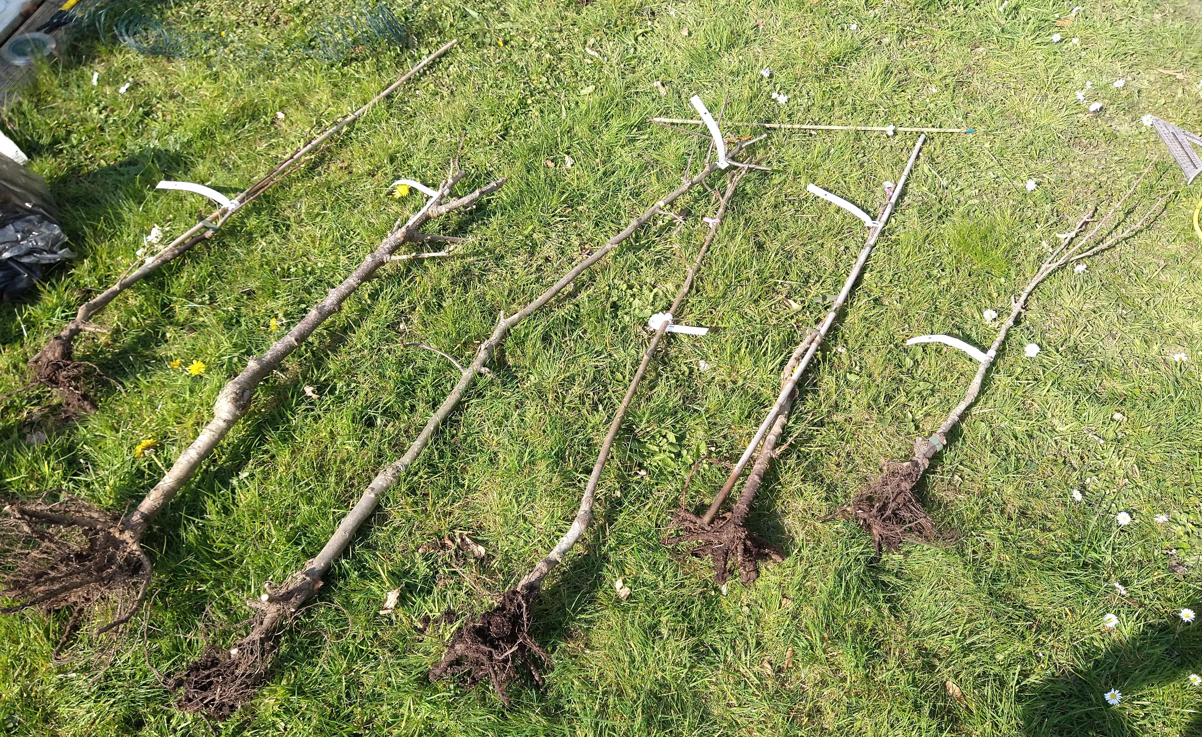 I put slightly more thought into the order of trees this time, with two varieties of apple next to each other, then two cherry trees followed by a pear tree and a plum tree. At the end I planted an apple tree from last year which was older than the other dwarf trees. It had already been moved once but didn’t seem to mind a change of scenery. Most of the varieties are self-fertile, but planting similar fruits together can still aid fertilisation and improve crops.