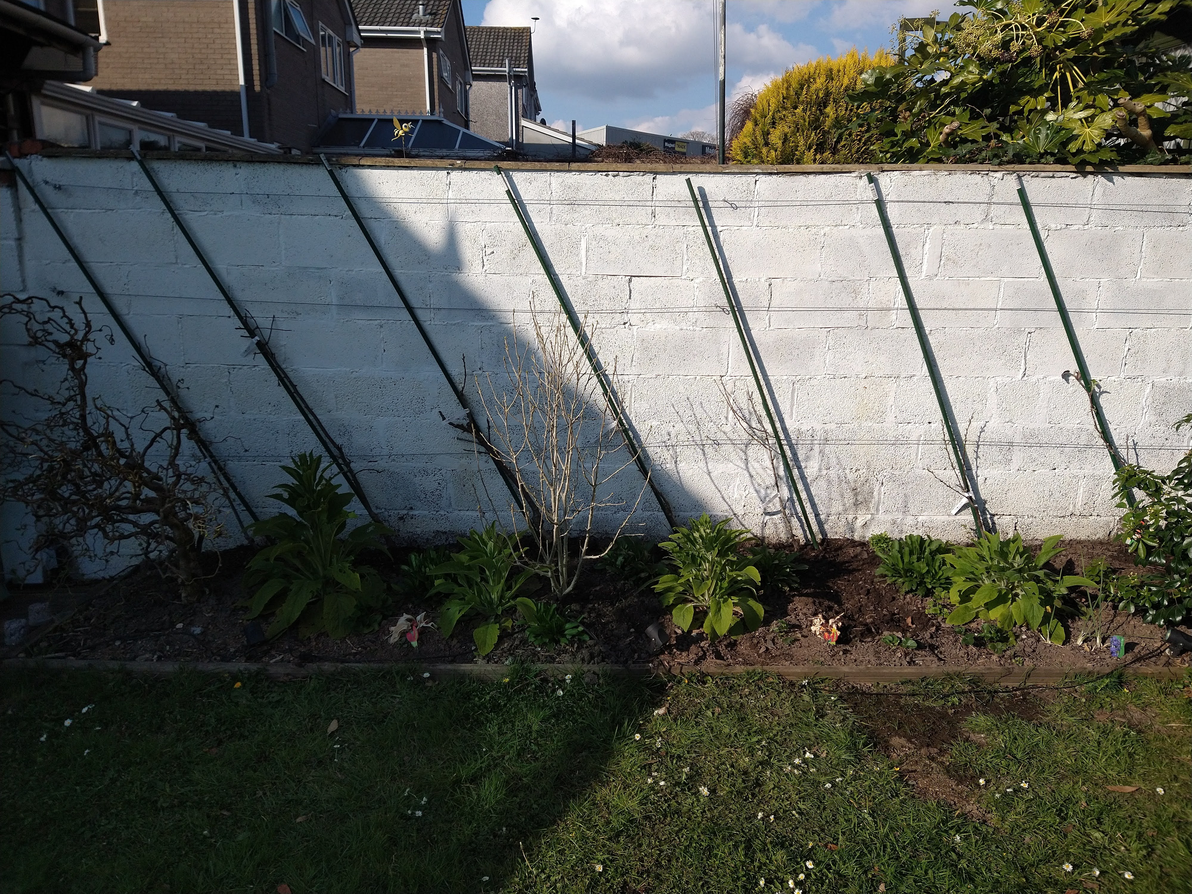 The goal: make the garden as productive as possible by cramming in fruit trees to every possible sun exposed site. Following on from my efforts last year and with greater plant availability (likely due to the novelty of gardening wearing off for most folks) I set out to organise my cordon properly. Well, as “proper” as I was going to be able to manage as I left the tree ordering until relatively late in the season. Ideally bare root fruit trees should be planted in Autumn or early Spring, but in my defence I had a smaller, louder and more wriggly distraction around the house. The trees I planted last year were still relatively spindly, given their young age and late planting, but my plan involved moving the existing trees to pots as they are all dwarf root stock and shouldn’t grow to a large size. The patio is now covered in massive pots with small trees, so I might have to devise an automated watering system.
