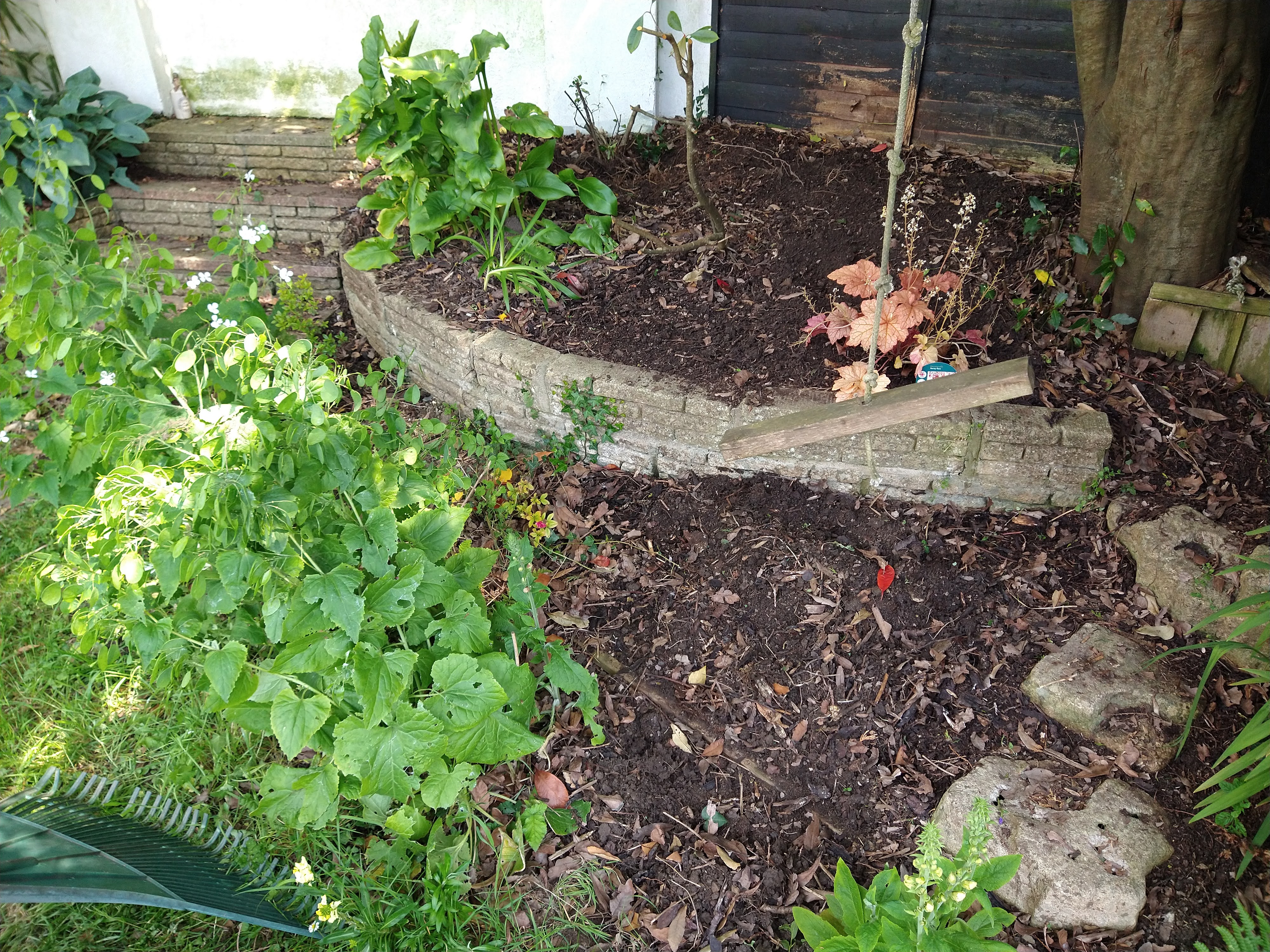 On the left the overgrown bed, on the right after the gutting. There are still a few plants to move and reposition, and a stubborn shrub.