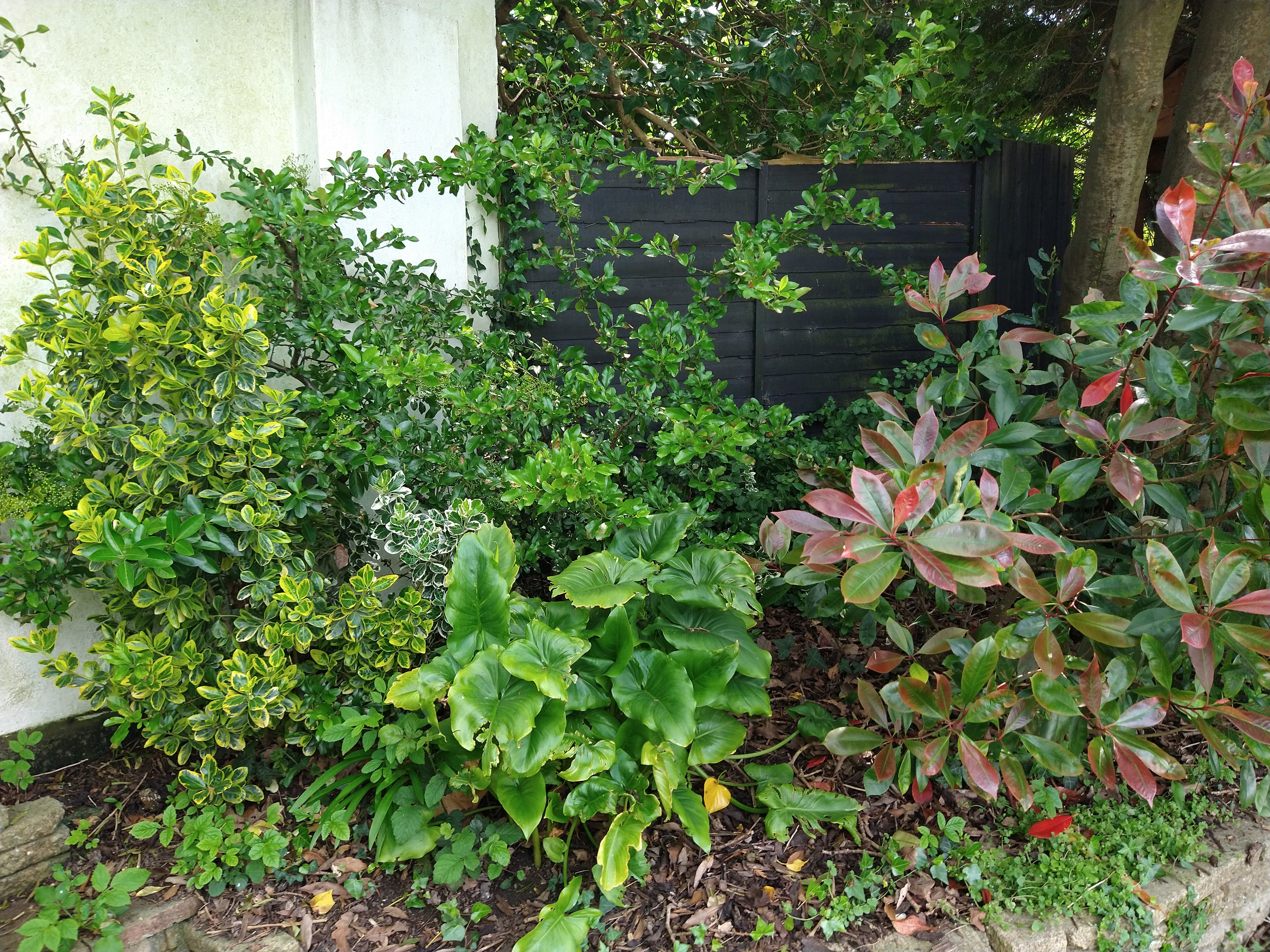 The beds at the side of the house were verdant but overgrown, and mint and lemon balm had broken out of pots and were spreading like wildfire. The adjacent weeds were climbing over the fencing too, and the bamboo clumps were growing out of control. One bamboo stem had reached about eight feet high. Not quite Eden project proportions, but still impressive and in desperate need of taming. Don’t let the beautiful weather in the before picture distract you, there is a massive improvement. The daisies taking over the cordon were also moved to the side beds to free up space.