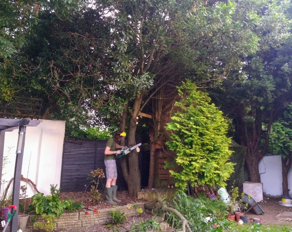 Several trees had been choked by ivy (one beyond saving) and a few larger trees needed branches removed. I put on my best lumberjack gear and brought out the electric chainsaw. In my mind “electric” and “chainsaw” made for a wimpy combination, but the reality was a slightly terrifying but highly effective piece of kit. Most of the time was spent planning and minimising the risk. The branches were down in no time at all once we’d decided where it was safe for them to fall.