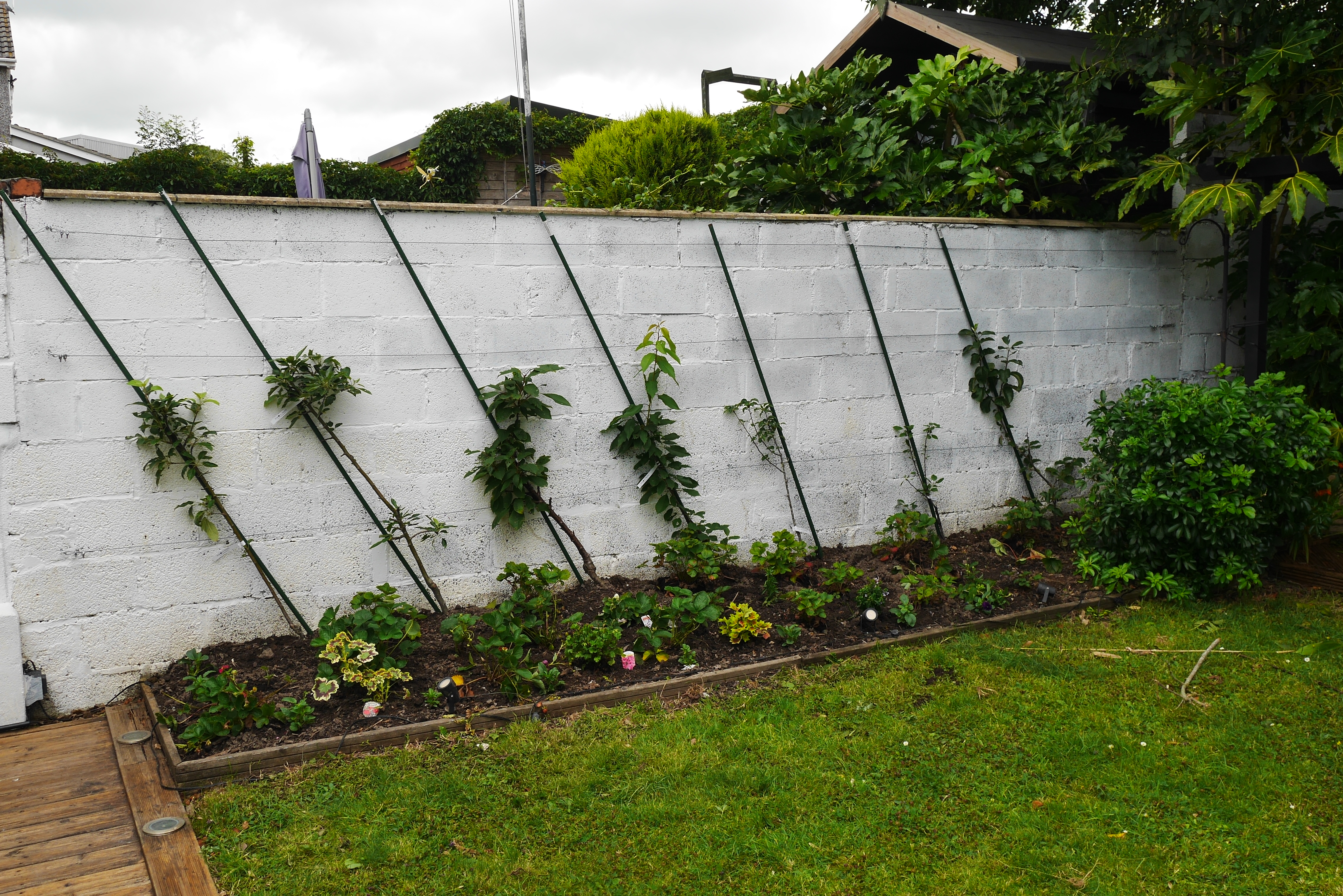 The corkscrew hazel, previously in front of the cordon, was moved to the bed at the end of the lawn. Relocating the taller plants will allow a lot more light to reach the fruit trees, hopefully facilitating more vigorous growth and fruit production. Moving established trees is always a bit dicey but so far the hazel doesn’t appear too shocked.