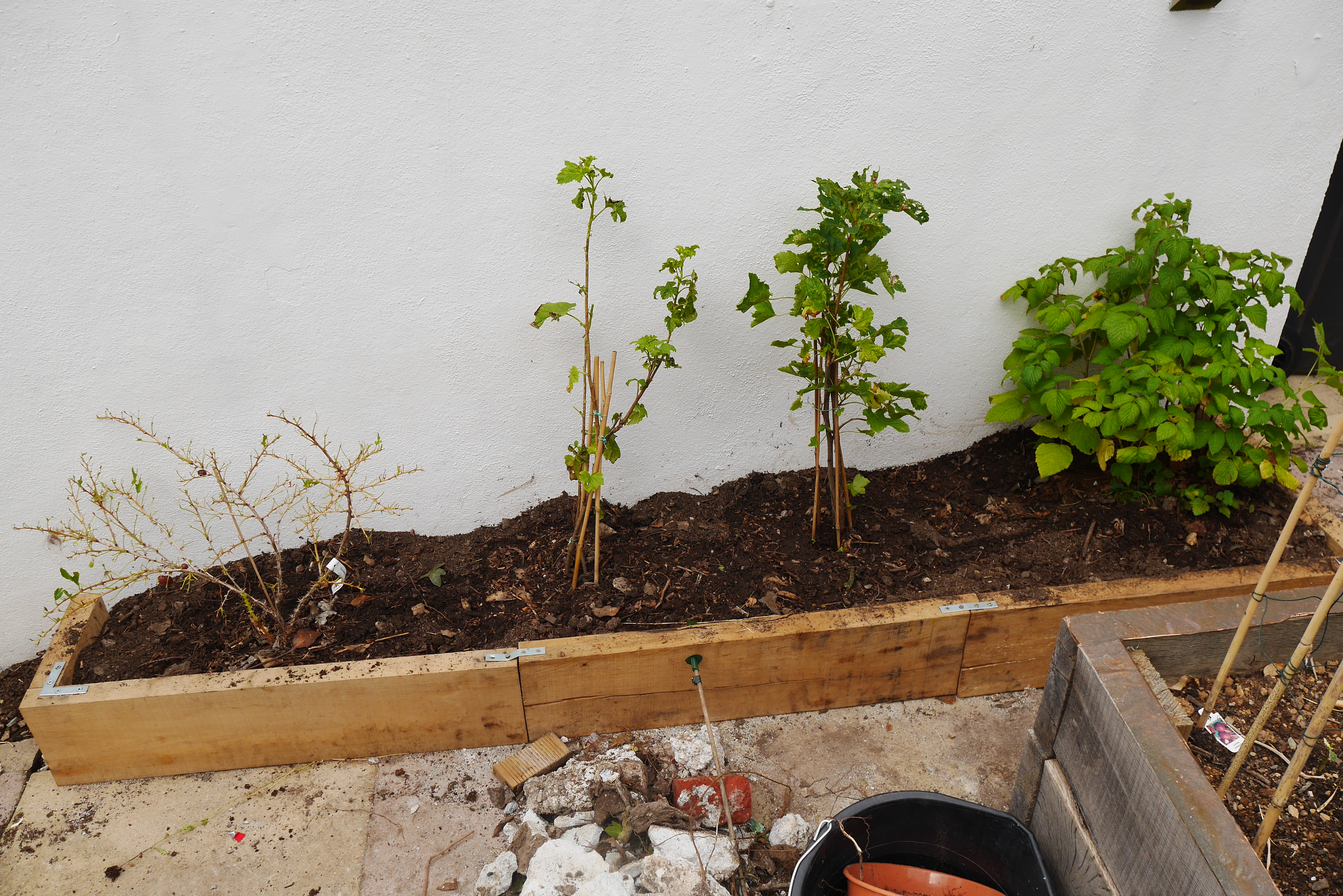 That’s just a fraction of the work my parents have been doing. I pitched in where I could, and one of the small projects I completed was a mini raised bed for the fruit bushes. After a liberal application of a 14 pound sledgehammer, the concrete at the edge of the patio was broken up and drainage-friendly. I used the left over oak from the main raised beds to create a small space into which we will grow raspberries, blackcurrants, redcurrants and gooseberries. If the gooseberries haven’t been completely destroyed by sawfly, that is.