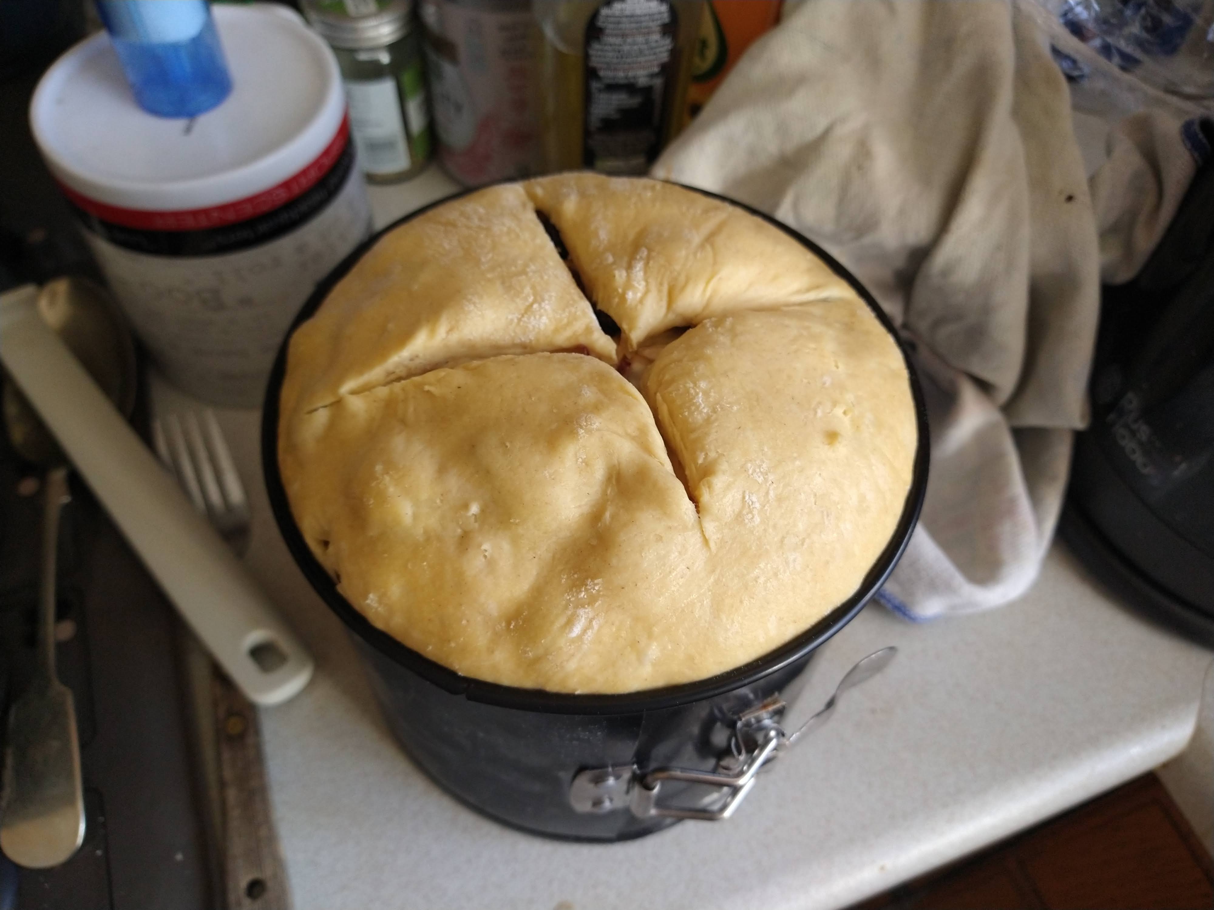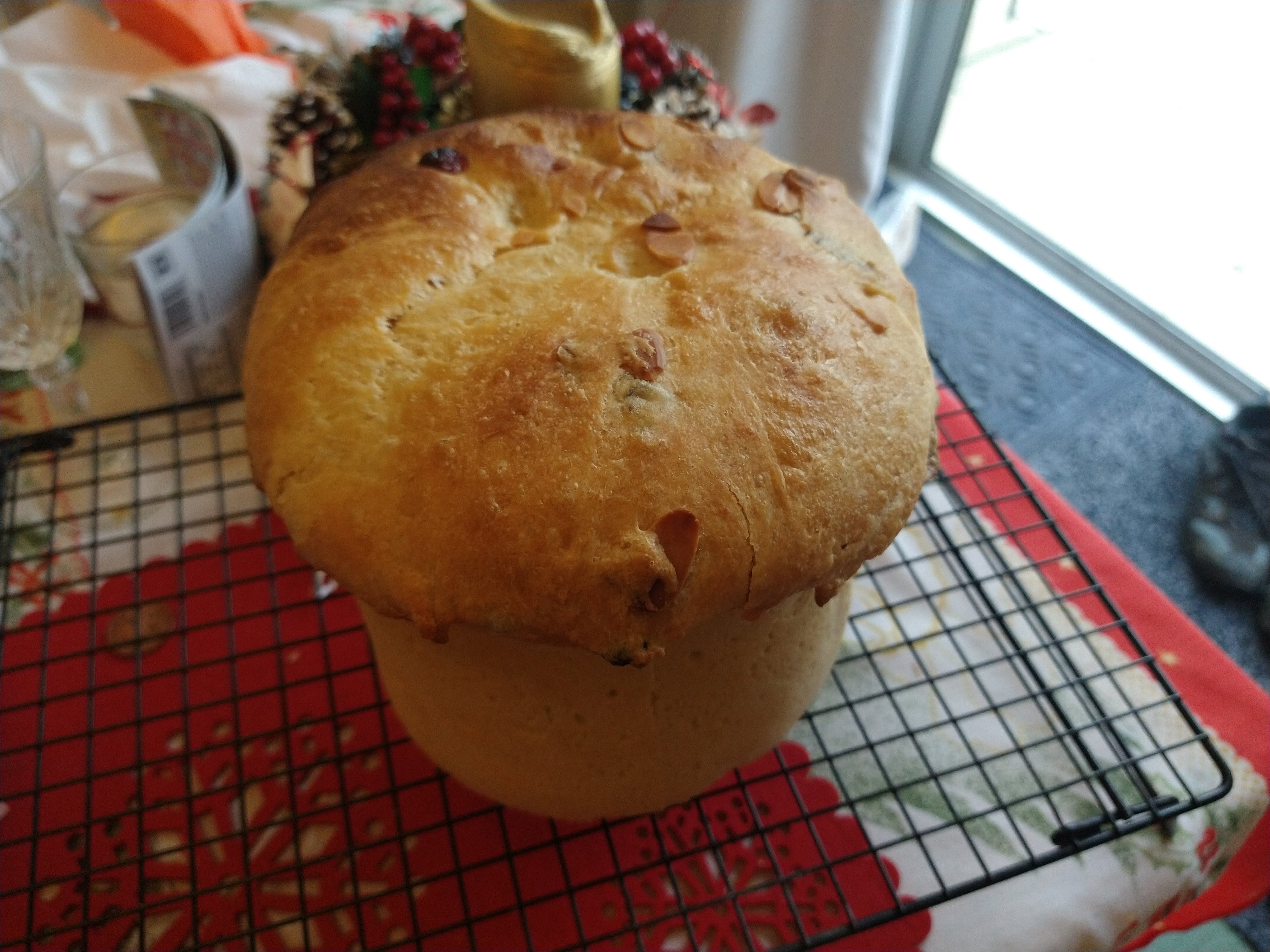 Pannettone is a kind of sweet bread originating in Milan, most often containing fruit soaked in alcohol. I couldn’t get hold of the right size of paper/card pannettone moulds, so instead I bought a springform version that would hold around a kilo of dough. The recipe I went for was from Simply Recipes on the basis that it was well rated, and explained the logic behind some deviations from the traditional recipe. For example, the Simply Recipes version opted to use a sponge raising method which takes around 45 minutes before it’s ready to use compared with the traditional approach which uses a biga starter which is similar to sourdough but adds a day to the baking process. My attempt was complicated by an overlong proving period as we had to travel to Somerset, then baking in a different (inferior) gas oven with a dodgy thermostat. It wasn’t perfect (the centre didn’t bake completely and the outside was overdone) but the bits that did cook properly were delicious, and tasted like a more festive version of brioche.