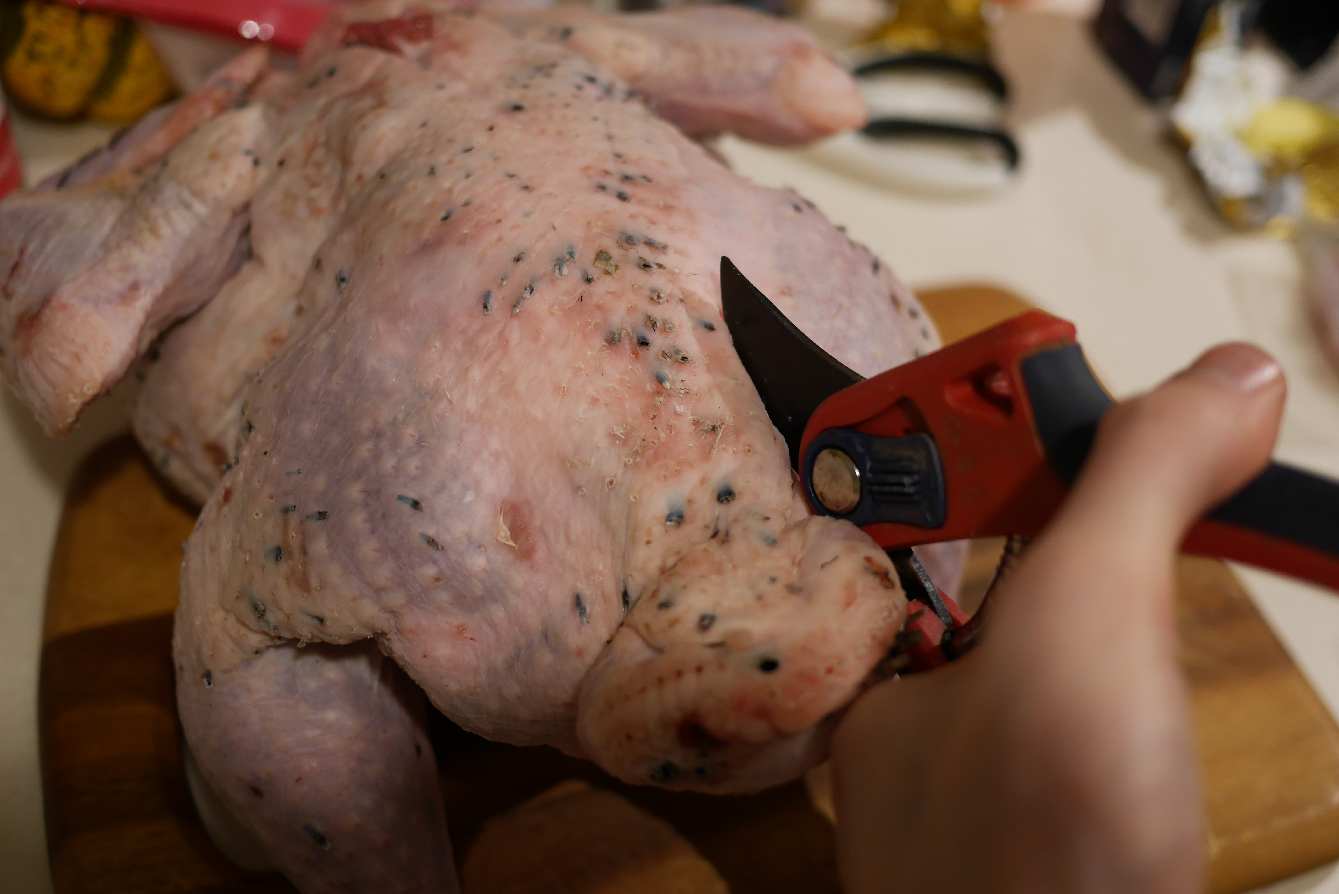 The spatchcocking process wasn’t as onerous as I was expecting, and after sterilising some secateurs it was turkey time. First, the turkey is placed breast-side down, then using turkey shears or an equivalent tool you cut down either side of the backbone, reserving it for the gravy. Removing the wishbone can make it easier to carve later, although I omitted this step. Then the turkey is turned over again and flattened out. The idea is to create a more even surface for cooking, allowing even browning all over and ensuring the breast isn’t over done. There’s no cavity for stuffing, although you can lay the turkey on top of a bed of stuffing instead. I opted to place chopped carrots, celery and onion in the bottom of the tray instead along with a little water.