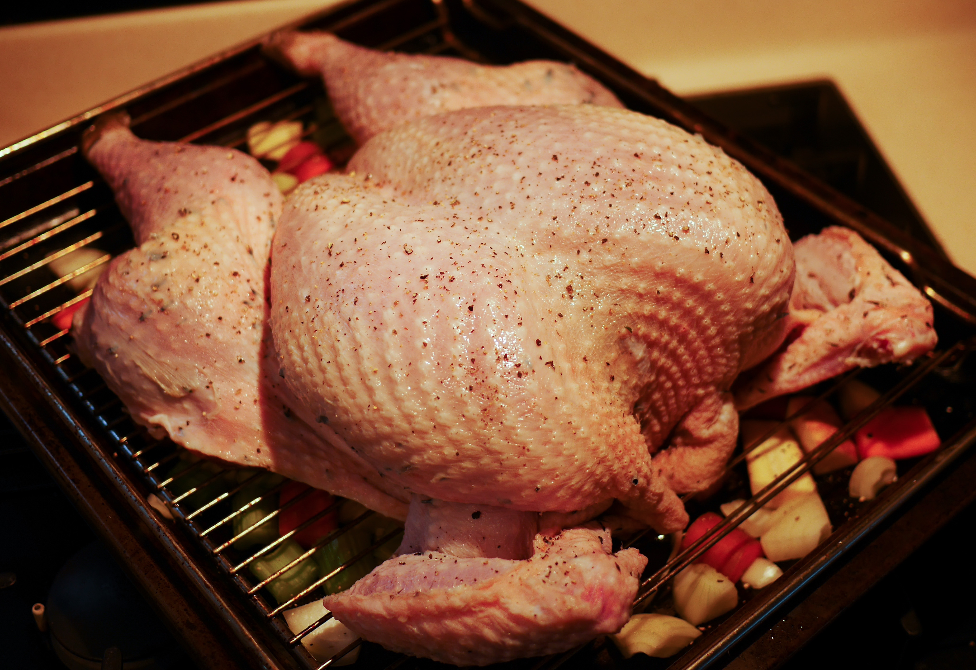 The spatchcocking process wasn’t as onerous as I was expecting, and after sterilising some secateurs it was turkey time. First, the turkey is placed breast-side down, then using turkey shears or an equivalent tool you cut down either side of the backbone, reserving it for the gravy. Removing the wishbone can make it easier to carve later, although I omitted this step. Then the turkey is turned over again and flattened out. The idea is to create a more even surface for cooking, allowing even browning all over and ensuring the breast isn’t over done. There’s no cavity for stuffing, although you can lay the turkey on top of a bed of stuffing instead. I opted to place chopped carrots, celery and onion in the bottom of the tray instead along with a little water.
