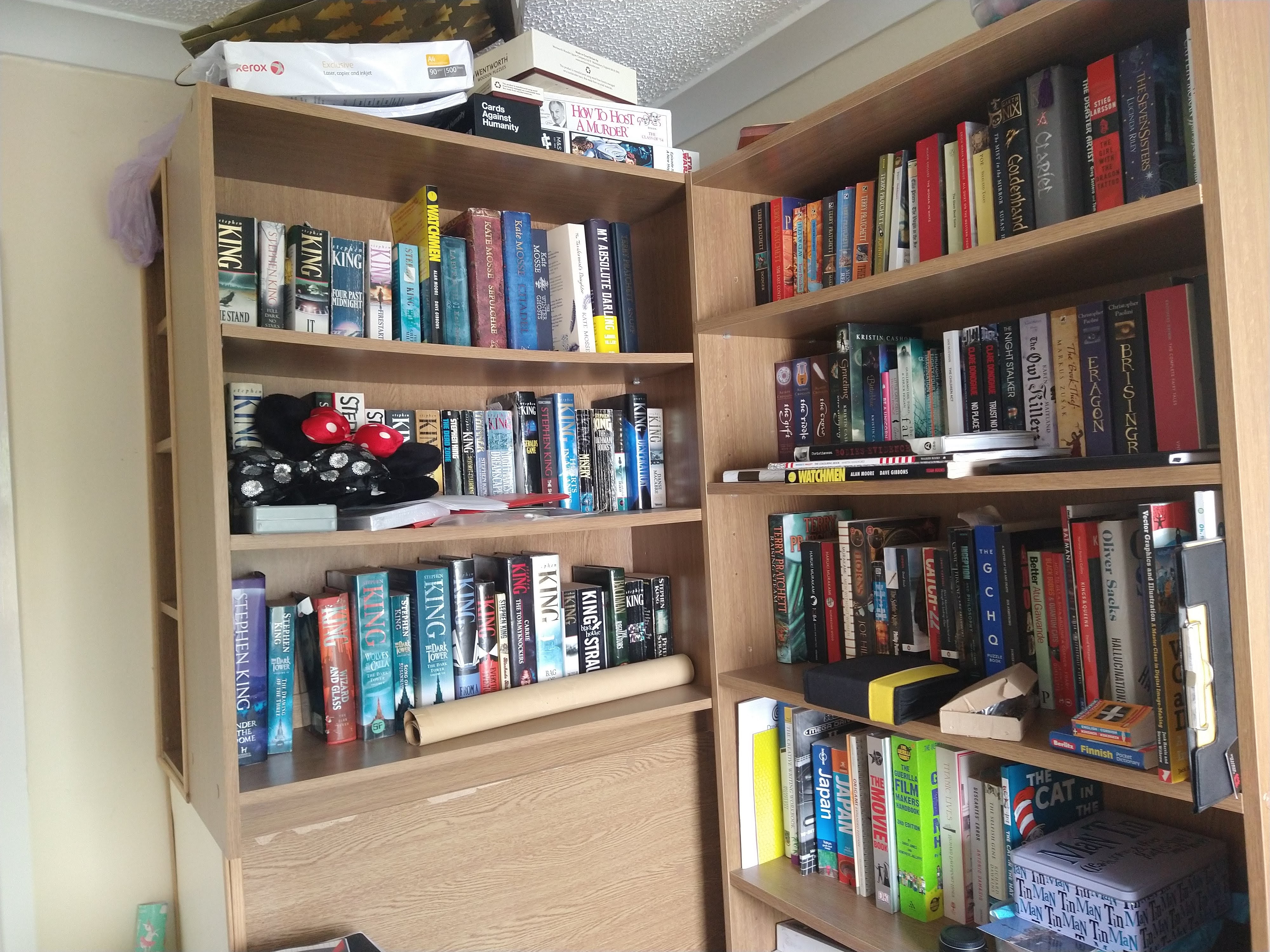 I’m sure I’ve complained about it before, but that won’t stop me from complaining again. I really hated the bookshelves left by the previous owner in our office. They were the cheap variety, veneer-faced chipboard and sagging in the middle. The configuration was also really weird and must have been born out of convenience.