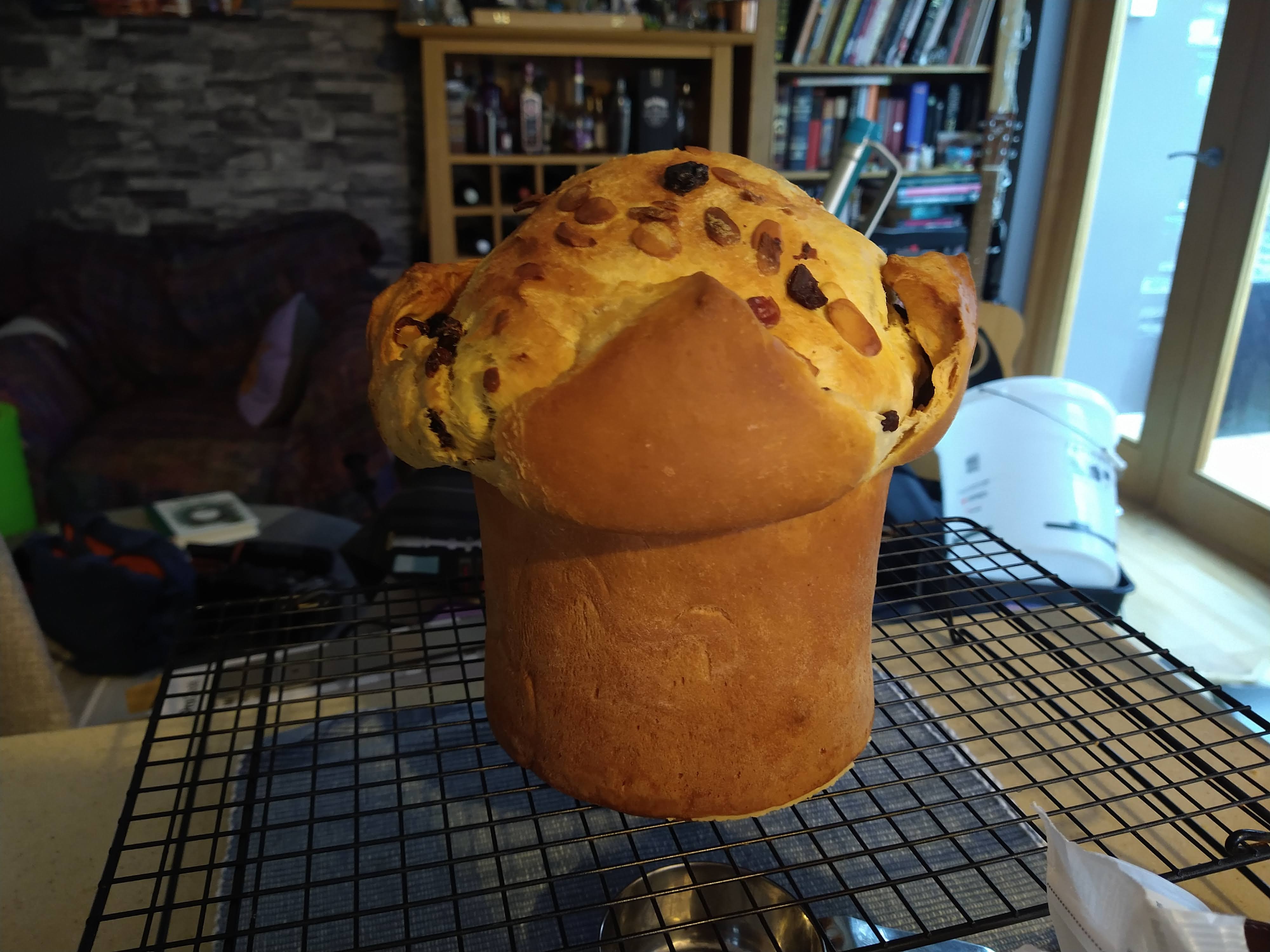 Pre-baking, the panettone looked in a much better state than last time. As before, I made a shallow cross-cut in the top and placed some butter in there. After the success of simply greasing and flouring the tin, I followed the same approach and eschewed greaseproof paper. One of my first thoughts on taking the result out of the oven was that the mixture could happily be reduced by a third given the rather bombastic mushroom-esque appearance.