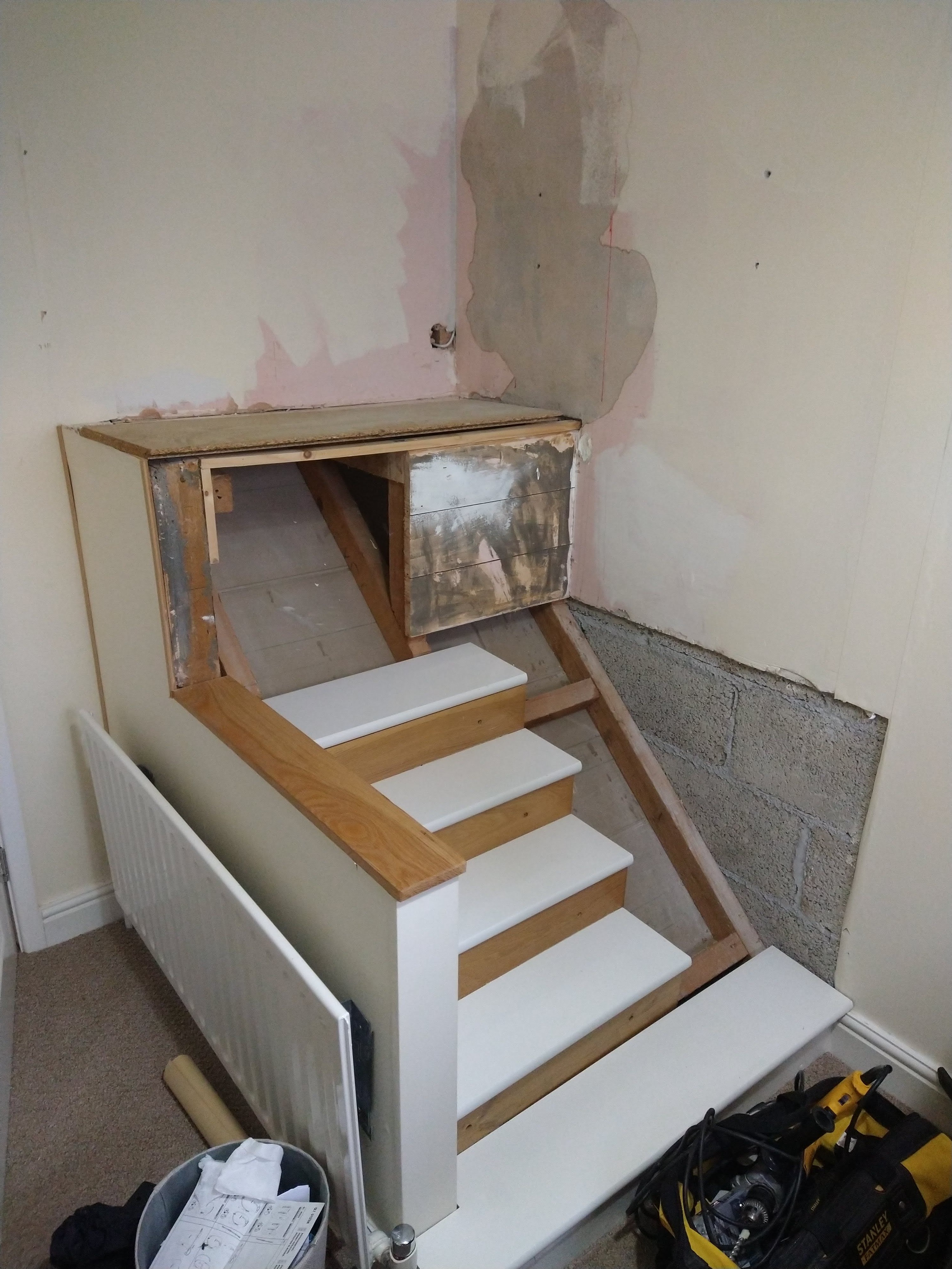 My aim was to create more usable space in an attractive way, integrating the bulkhead more naturally. How I would do that was another matter entirely. The first step was demolition and stripping everything back to get a better idea of what was underneath. It wasn’t exactly pretty.