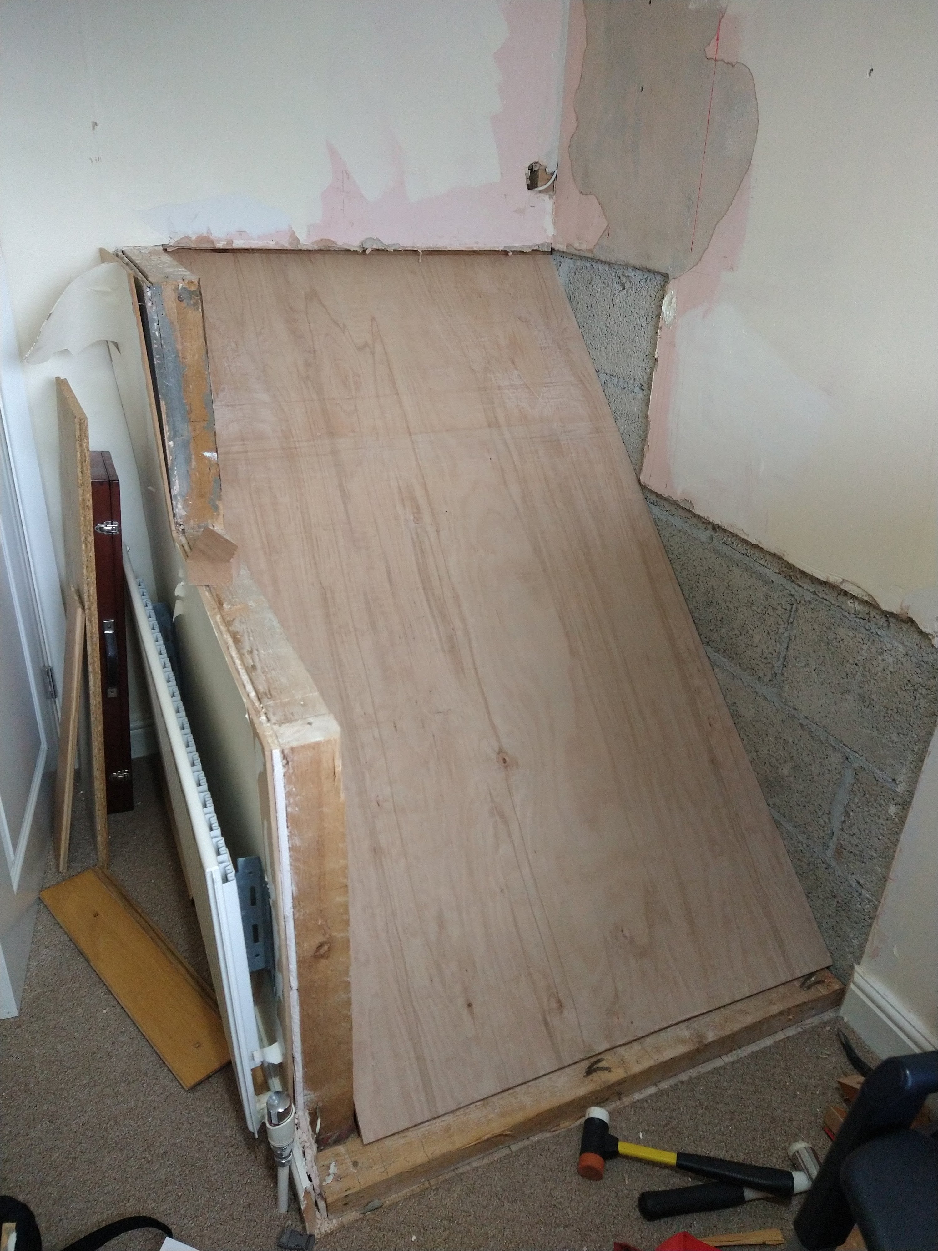 As part of the demolition, I removed the old cupboard frame and used a sheet of plywood to protect the bulkhead from damage. I had it cut to size by Totem Timber although it was a fraction out and needed some slight adjustments.