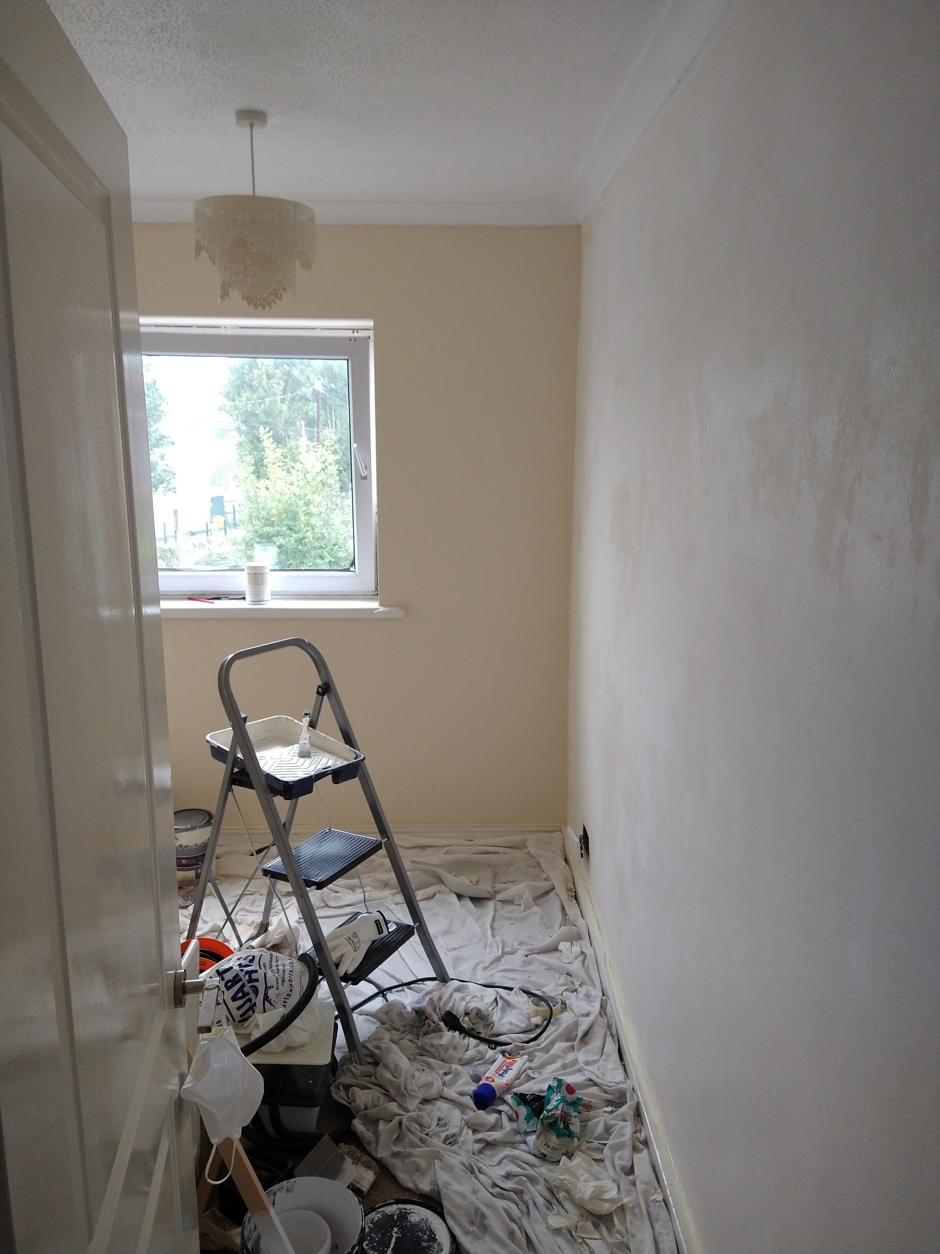 We decided on green for the feature wall on the right hand side, which is also going to be the instrument wall (giving homes to the many stringed instruments floating around the house at present.) The paint came from the Crown decorating centre in Plymouth and given how expensive getting it mixed was, I decided to put down a base coat on top of the old pink paint and ominous greeting from the distant past. (Remember Heather?) I typically use a brush to cut in the edges and roller for the bulk of the painting. Using a brush for the whole thing is quite time consuming and requires more skill, although probably uses less paint.
