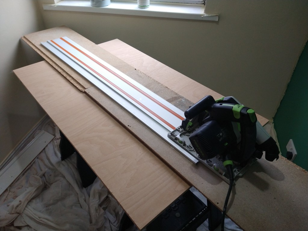 The next step was to start thinking about shelving. I bought the timber months ago now, and if you remember the saga of the track saw all the way back in February, you’ll know this has been a long time coming. This is the second saw (Festool TS55, and third saw overall), as I sold the first one for spares after a traumatic repair experience. I hadn’t even trimmed the splinter guard on the rails that guide the saw. In retrospect there was no way I was going to be doing any major work that close to my FRCPath Part 2 exam but I had successfully deluded myself into believing that I needed one as soon as possible.
