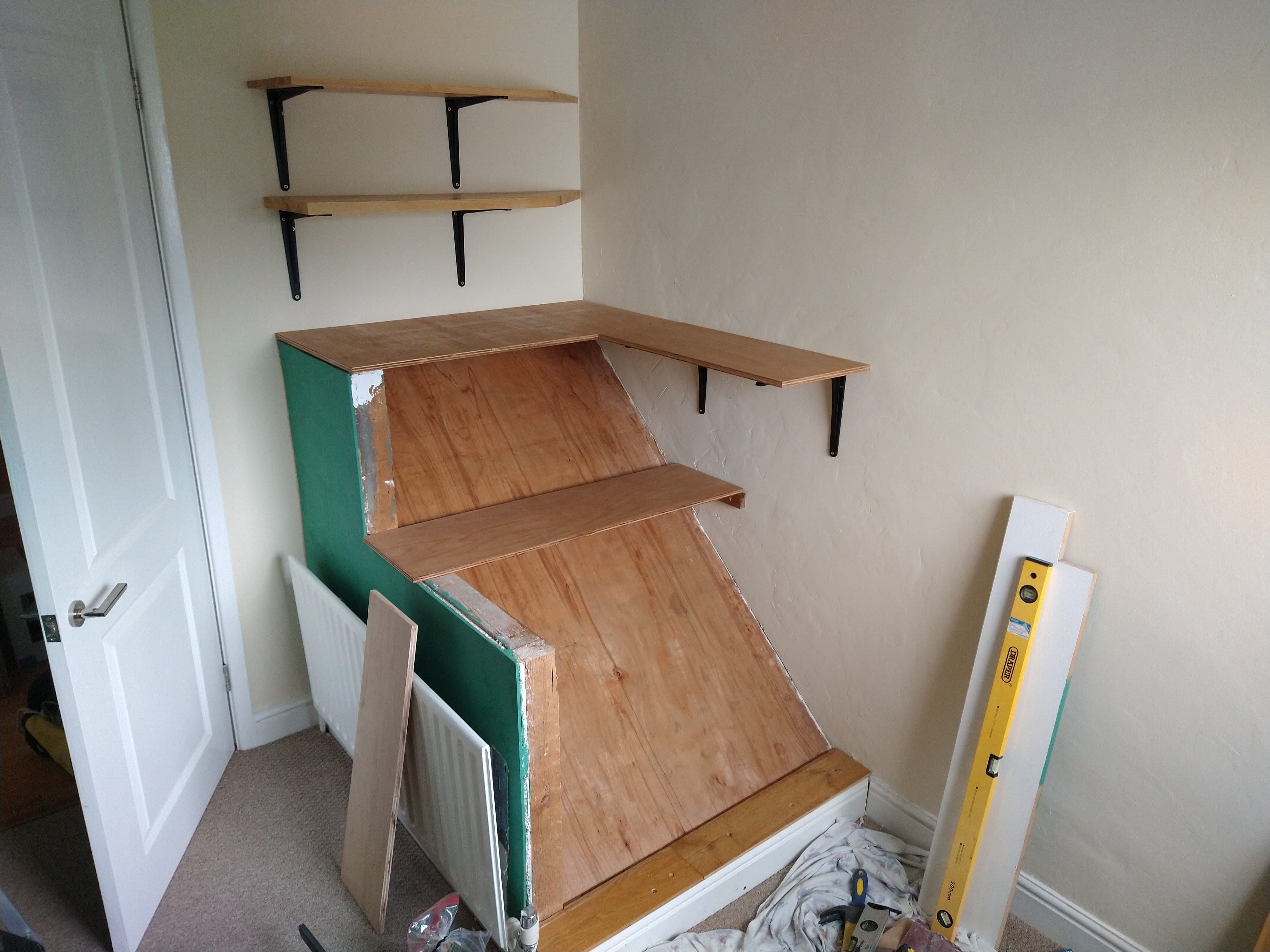 Since the last post I’ve put up a few more brackets and finished some more shelves. I did a little touch-up painting on the coving as well. The project is moving along nicely now. It is also developing on the desk front as I will reveal in a later post. I’m moving on from my trusty glass one to a wooden top that will be more in keeping with the new aesthetic. For now I’ll leave you with a photo of the current state of play.