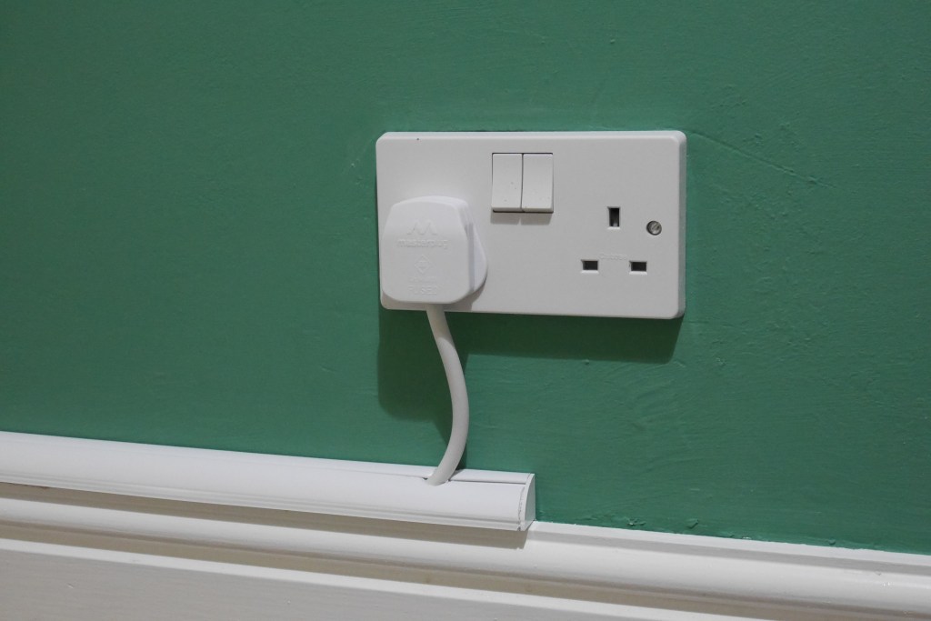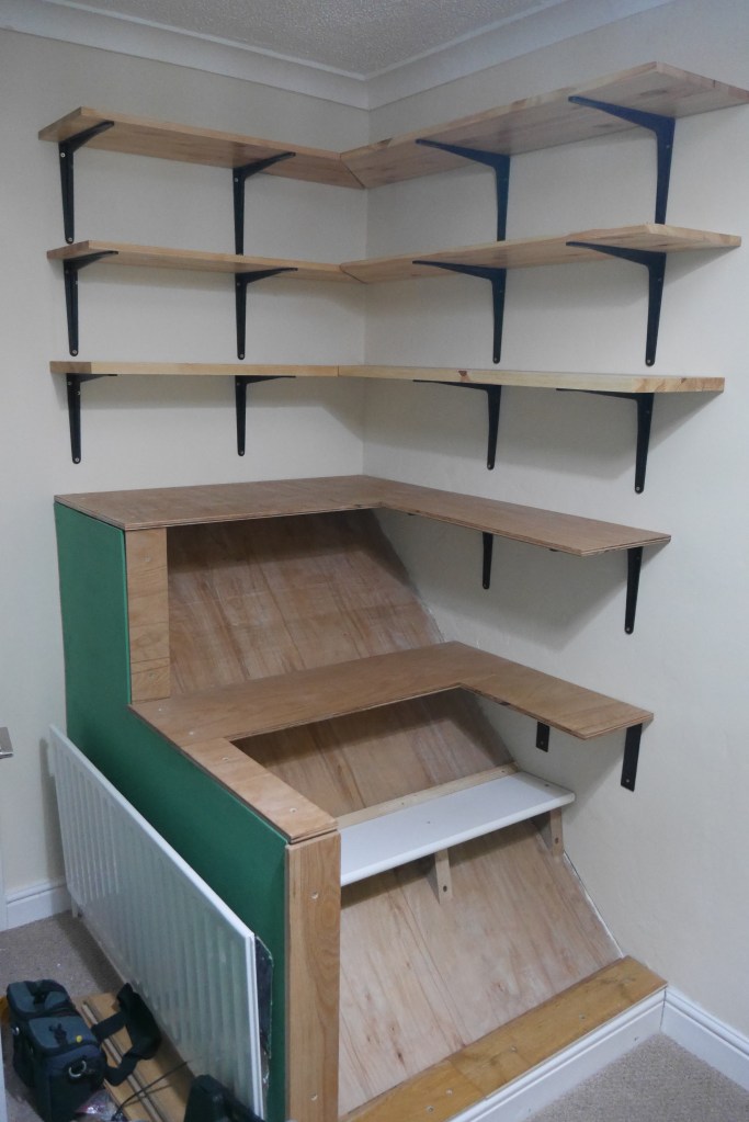 I’ve been putting the finishing touches and fitting the final shelves this week. There are still a few niggles to sort out including a few paint touch-ups, fills and network cable termination to do. I have put down conduit above the skirting board though to conceal the trailing socket cable and network cable.