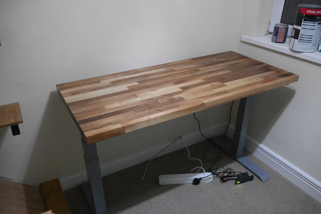 The worktop just about fitted in the car and I got it back home safe and sound, only to attack it with a saw. It was 1.7m and the biggest desk the space would comfortably fit was 1.4m. Out came the tracksaw again. A little sanding and some Danish oil later and I had a really beautiful piece. Put it together with a Flexispot E6 standing desk frame and I’ve got a kick-ass desk. The assembly wasn’t that onerous either and the bolts were all the same hex key fitting which was a sensible design choice.