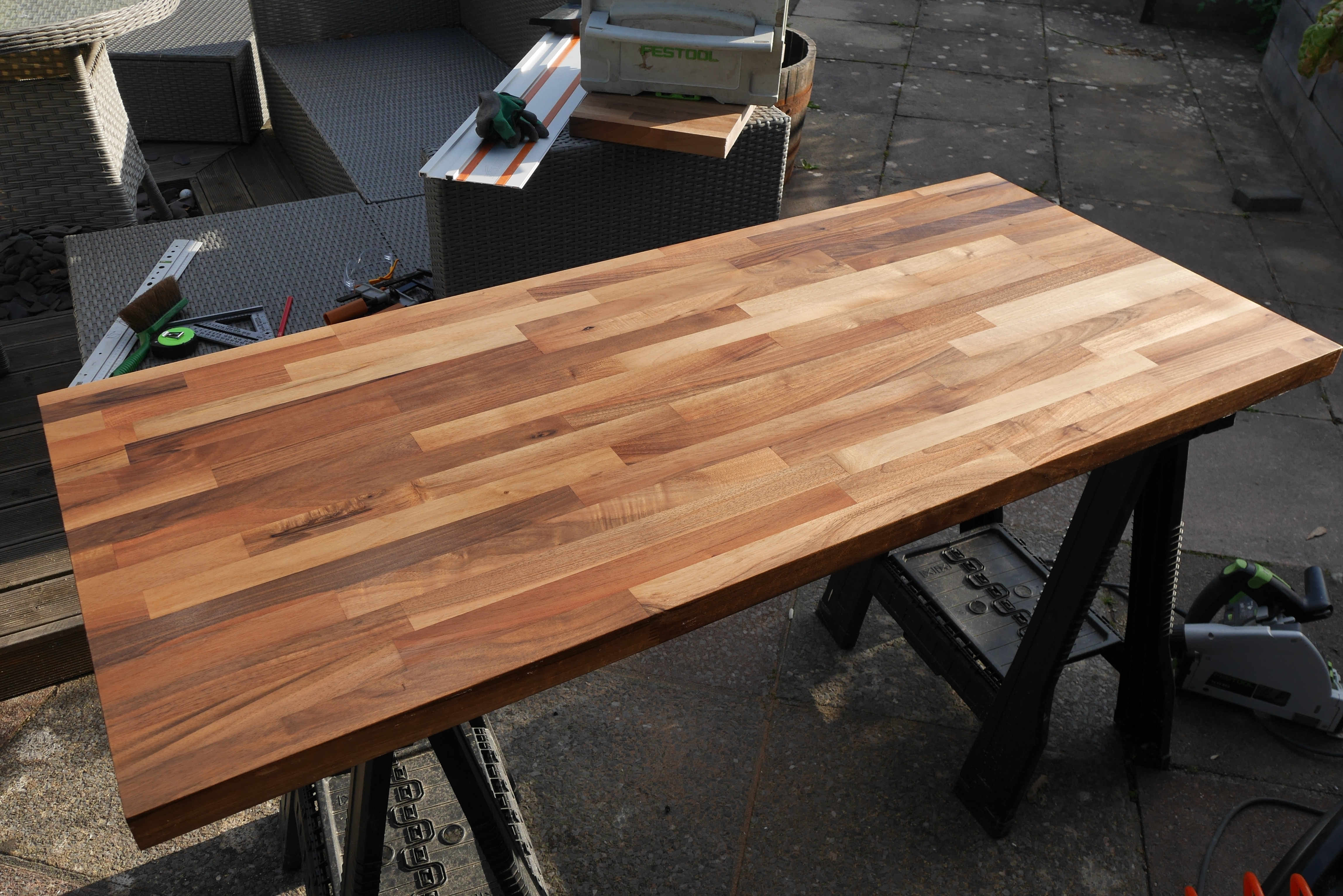 The worktop just about fitted in the car and I got it back home safe and sound, only to attack it with a saw. It was 1.7m and the biggest desk the space would comfortably fit was 1.4m. Out came the tracksaw again. A little sanding and some Danish oil later and I had a really beautiful piece. Put it together with a Flexispot E6 standing desk frame and I’ve got a kick-ass desk. The assembly wasn’t that onerous either and the bolts were all the same hex key fitting which was a sensible design choice.