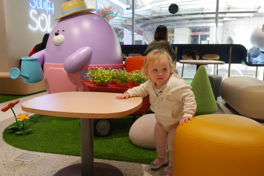 Café Swith Sol in Myeongdong is a café opened by a major Korean bank. The interior was really interesting and ideal for Evie, but the food was so-so. The cookies we bought were not the best of the batch, but apparently the business employs primarily deaf staff so it was nice to be able to support a social enterprise in a place that seems to embrace an overwhelmingly capitalist culture.