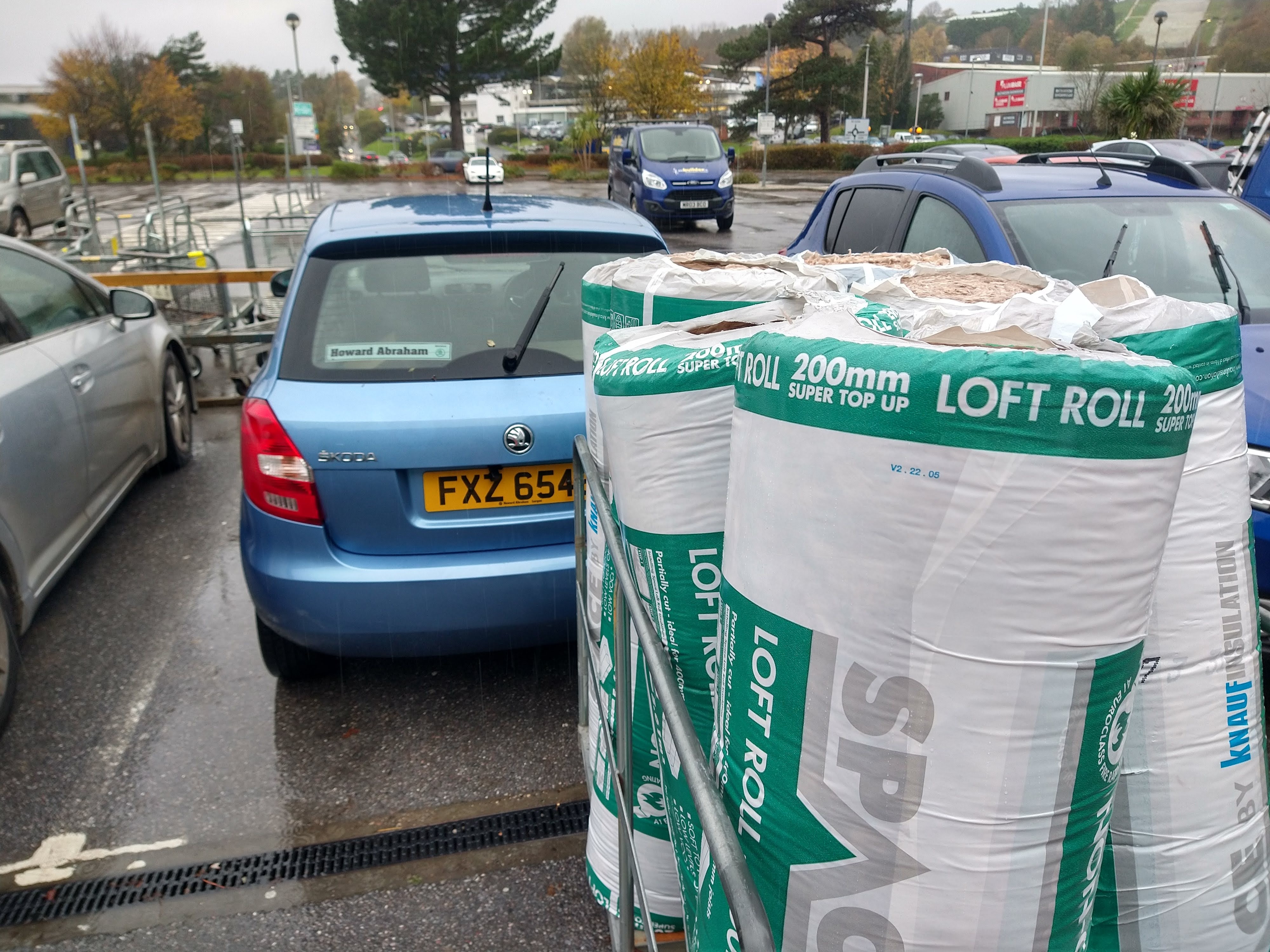 Needless to say, it took two trips. I did manage to fit four rolls of glass mineral insulation in the car alongside three packs of loft boards. The Tetris-like abilities of the Skoda Fabia never cease to amaze me. Except when I flew too close to the sun and attempted to put a shelf through the windscreen.
