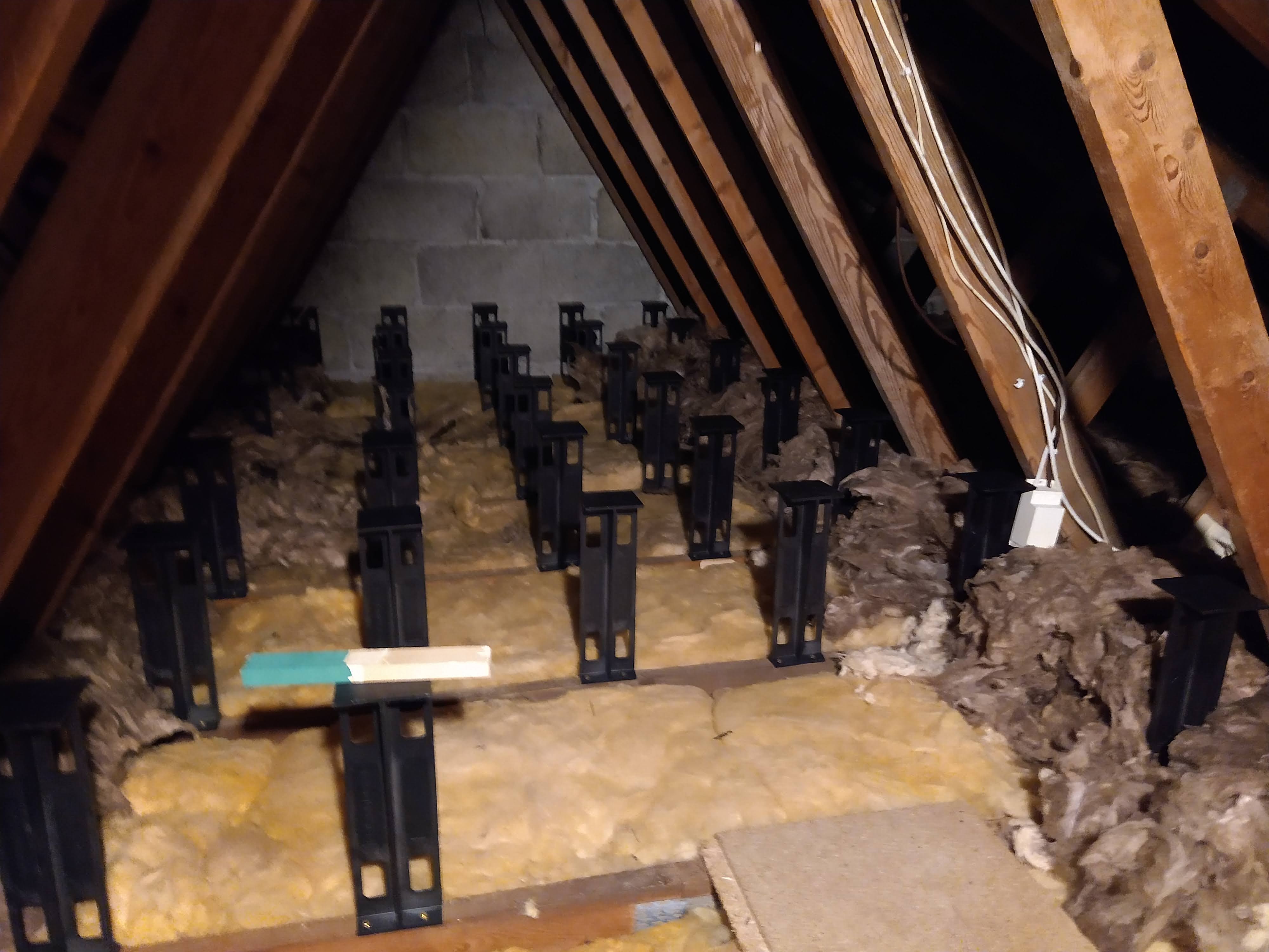 Energy prices are officially insane, and having a weedy 100mm of compressed wool insulation (boarded over) is no longer sufficient when the government guidance is for 270mm. Having the loft for storage is necessary when you have as much stuff as we do, so doing away with the boards entirely wasn’t going to be an option. The more realistic plan was to loft the loft. Raising the level of the floor with plastic loft legs allows a thick layer of insulation to be laid down while still having a platform to store things on. The resultant flooring isn’t as sturdy as boarding onto the joists, but we only require intermittent access to the space so it’s not a big deal.