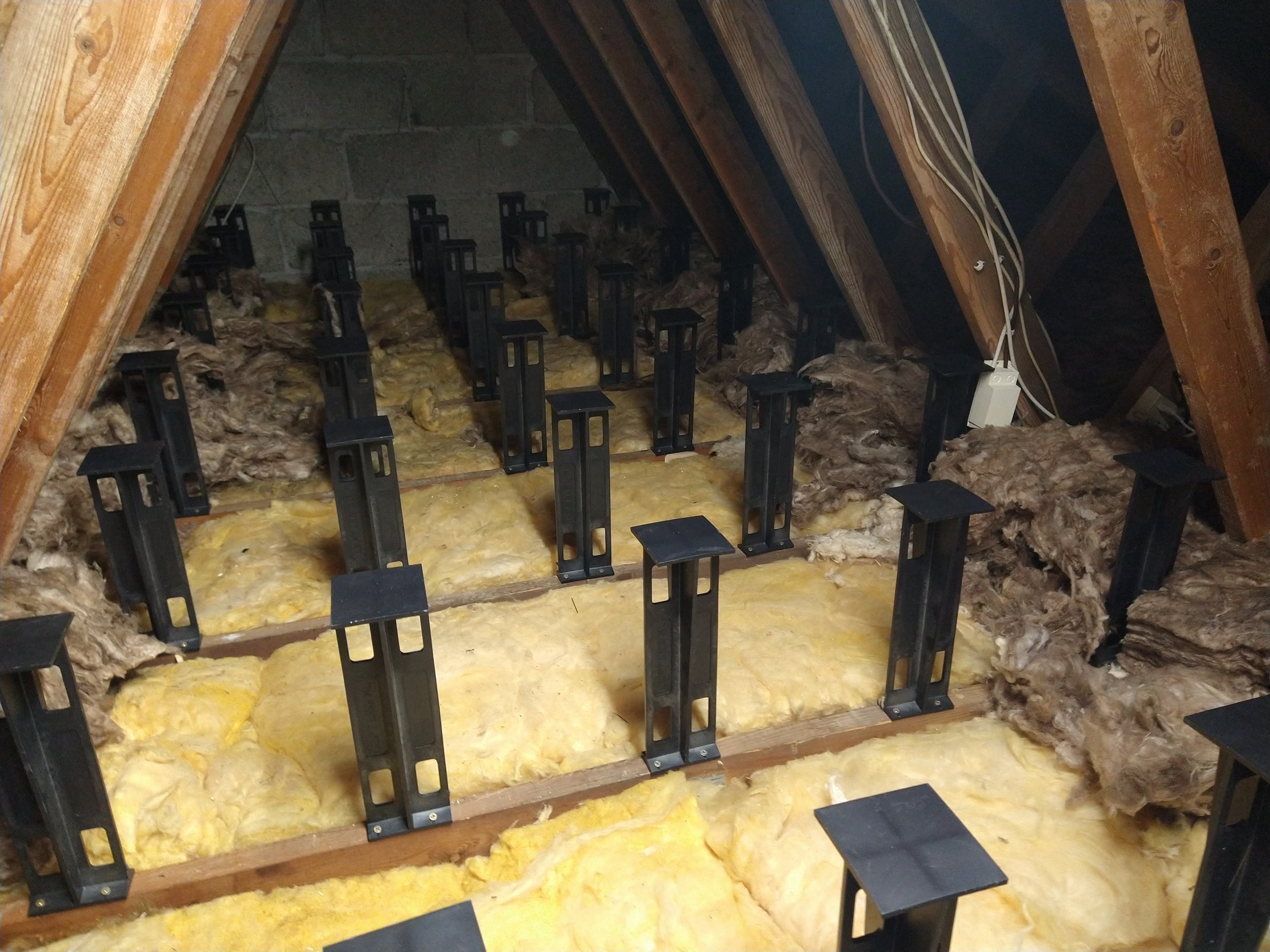 Once all of the legs were in place, the boards were sat on top of them and screwed onto the top platform of each leg. It’s not the sturdiest construction ever, but it will be more than adequate for storing lightweight items. The key point is getting an additional 200mm layer of insulation while maintaining an air gap between it and the boards, reducing condensation and mould formation.