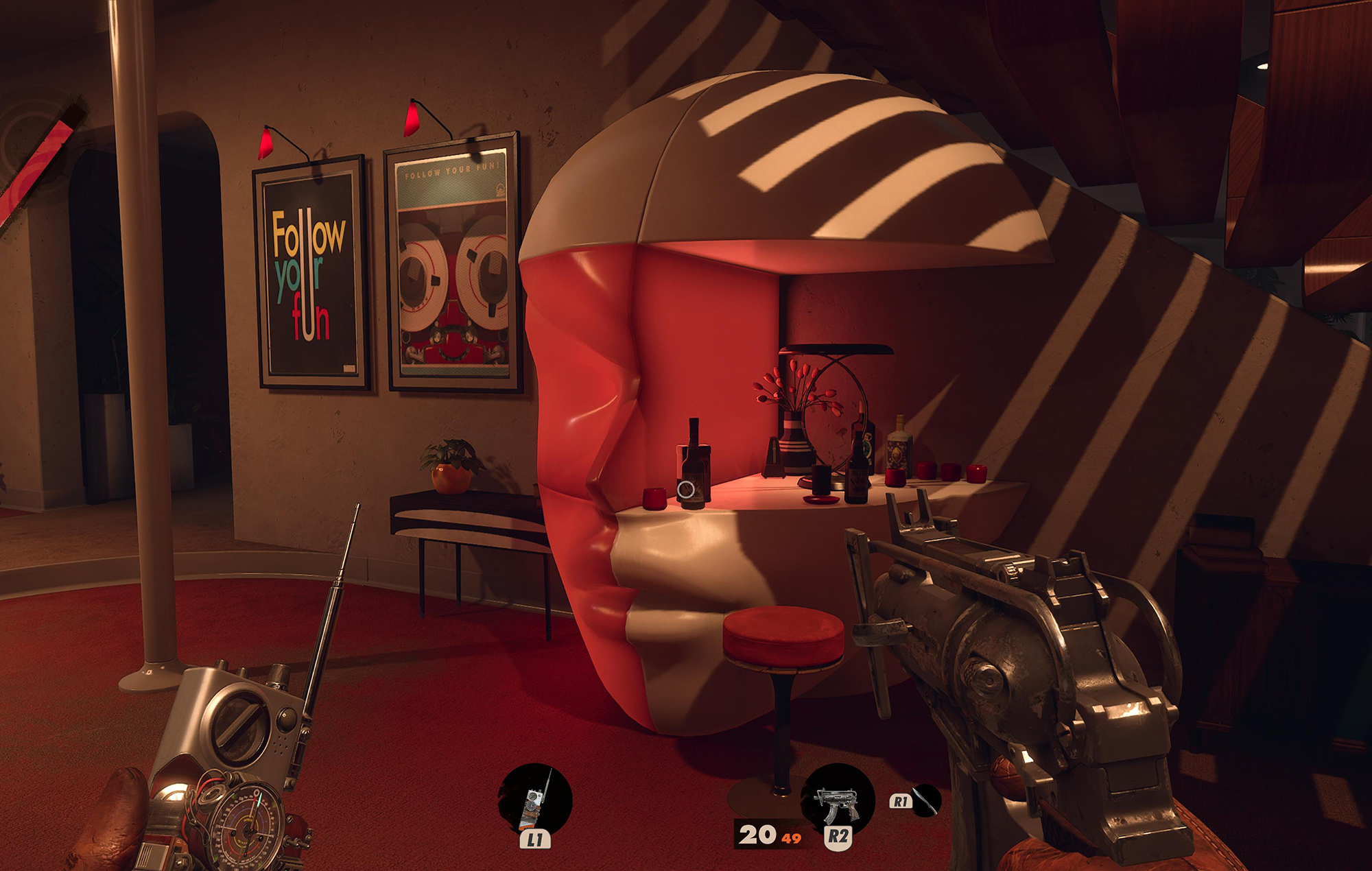 Deathloop follows Colt, a man attempting to disrupt a time-loop on a remote island causing the inhabitants to live out the same 24 hours over and over again. You can only achieve this by assassinating a number of targets, essentially executing the perfect loop, before midnight of the same day. The setting feels very 1960s, although with a weird twist here and there. There’s a little “No One Lives Forever” flavour to the setting and equipment, and also a cartoonish quality.