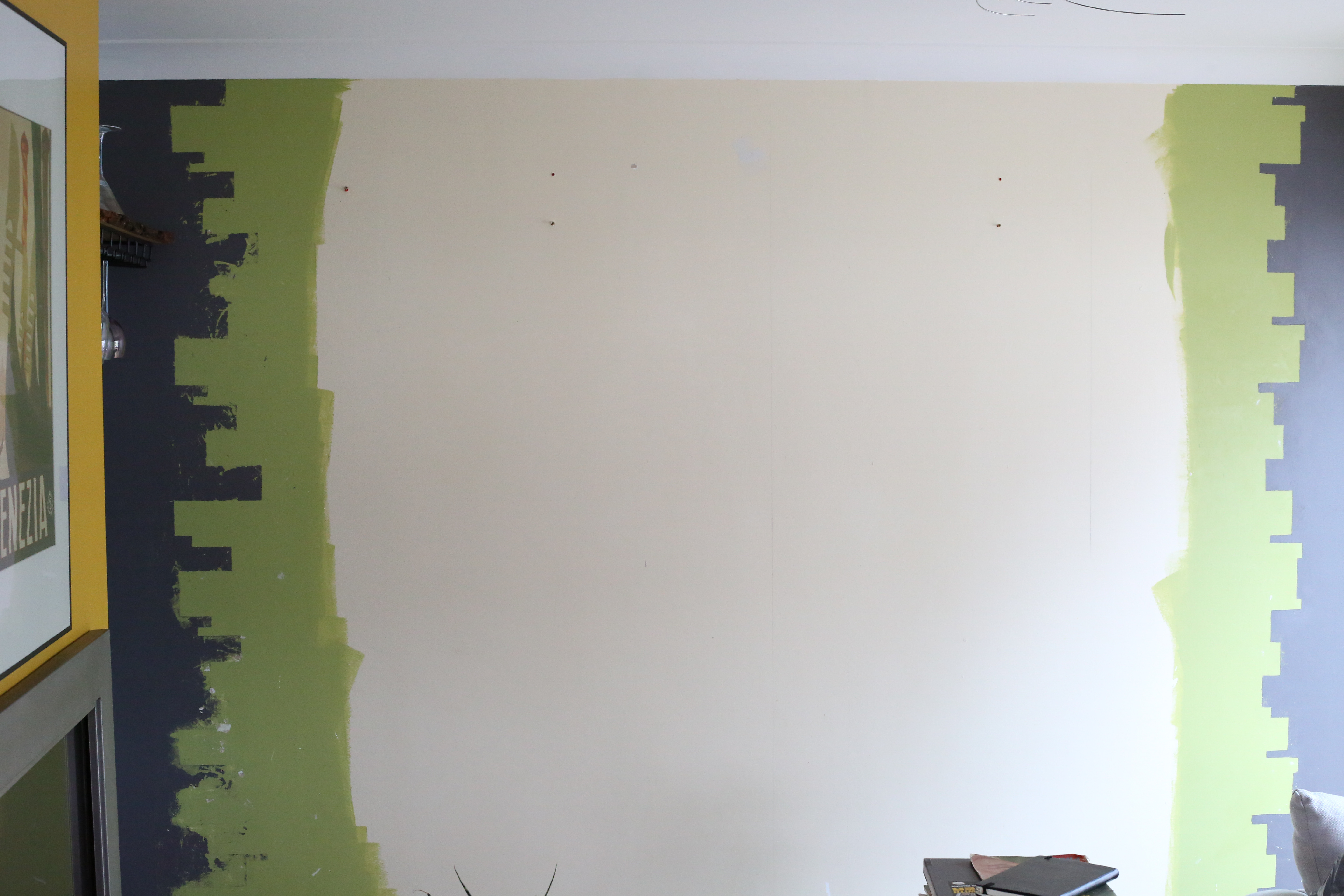 After washing the wall, I had to remove wall plugs, fill holes with Polyfilla, masking tape, and finally give the whole thing a light sand. I started trying to pull the plugs out with pliers, then leaving the screw in a little and pulling, but the fastest (and cleanest method) was drilling them out. It takes a few seconds and the waste is easily brushed out.