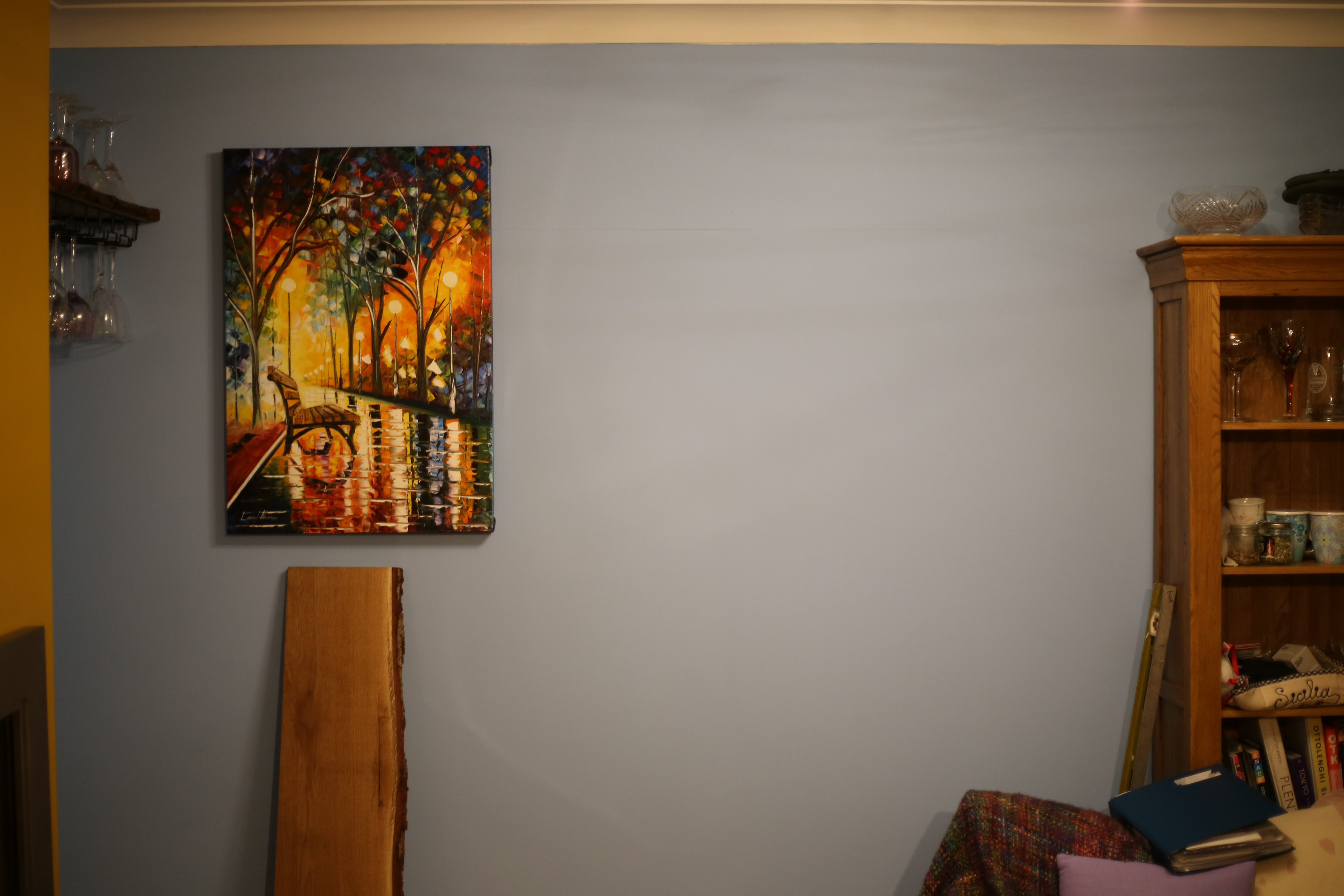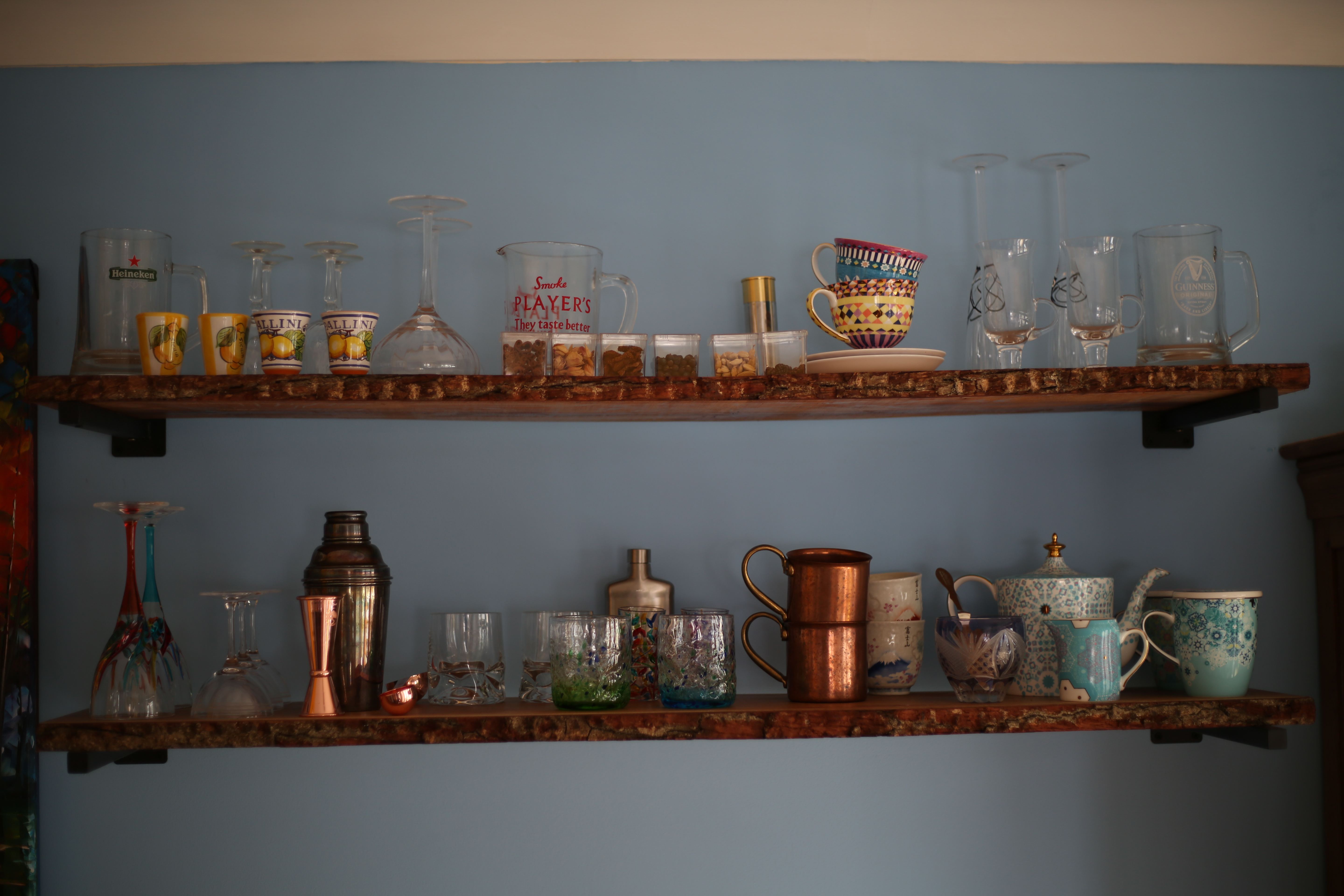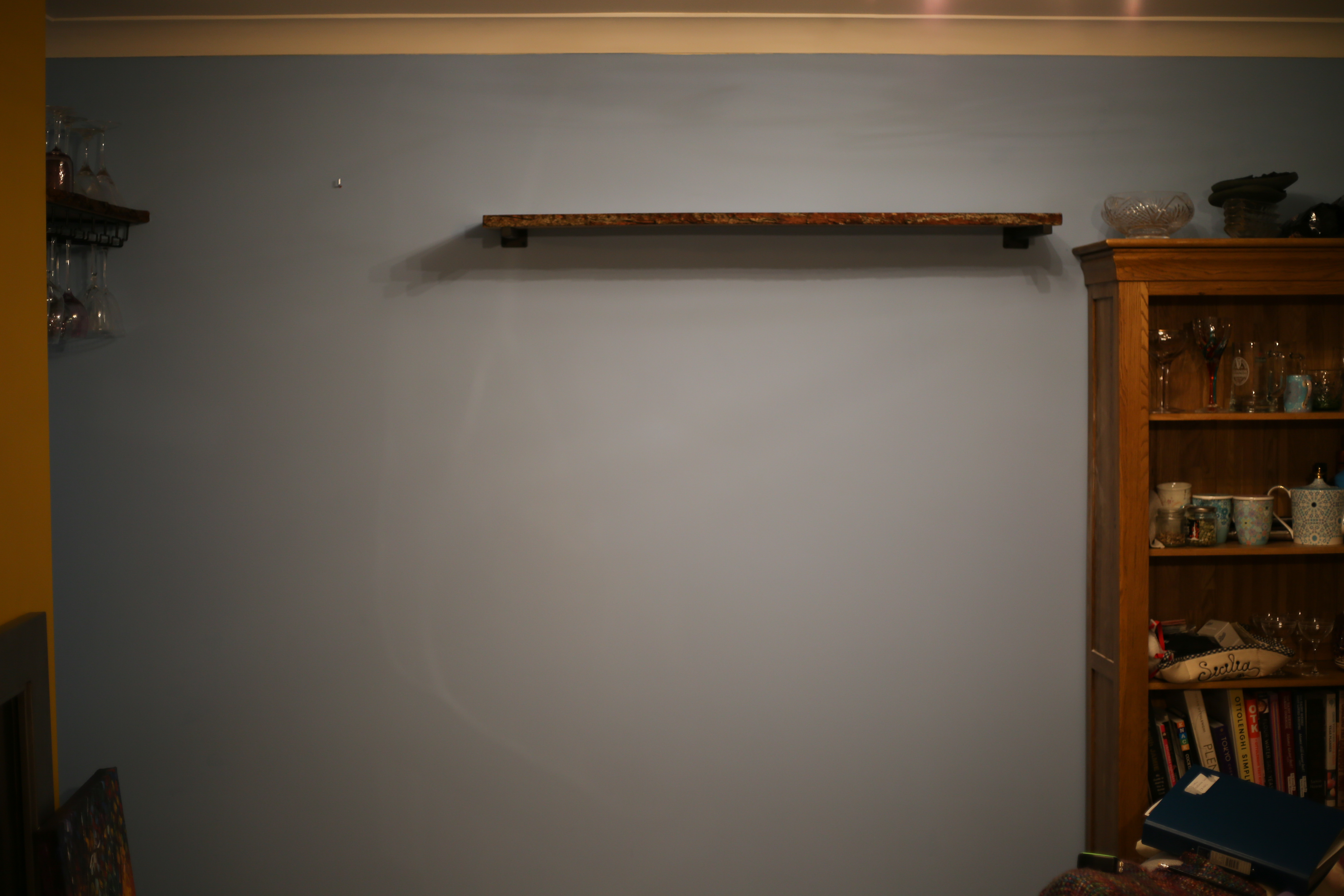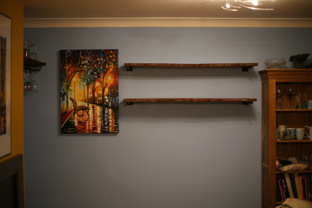 Hanging pictures and anything from walls is a skill I learned from my grandfather, and one that is immensely useful in day to day DIY. I used his level to draw a line and sited the brackets along it close to the end of where each shelf would be. Oak is a very strong wood so I have no concerns about it bowing over the 1.2m length of the shelves. The natural edge meant that the front receded a little towards the right of the bottom shelf, but it just adds to the charm. All that was left was to secure the shelves to the brackets with a couple of screws and leave the finish to dry completely.
