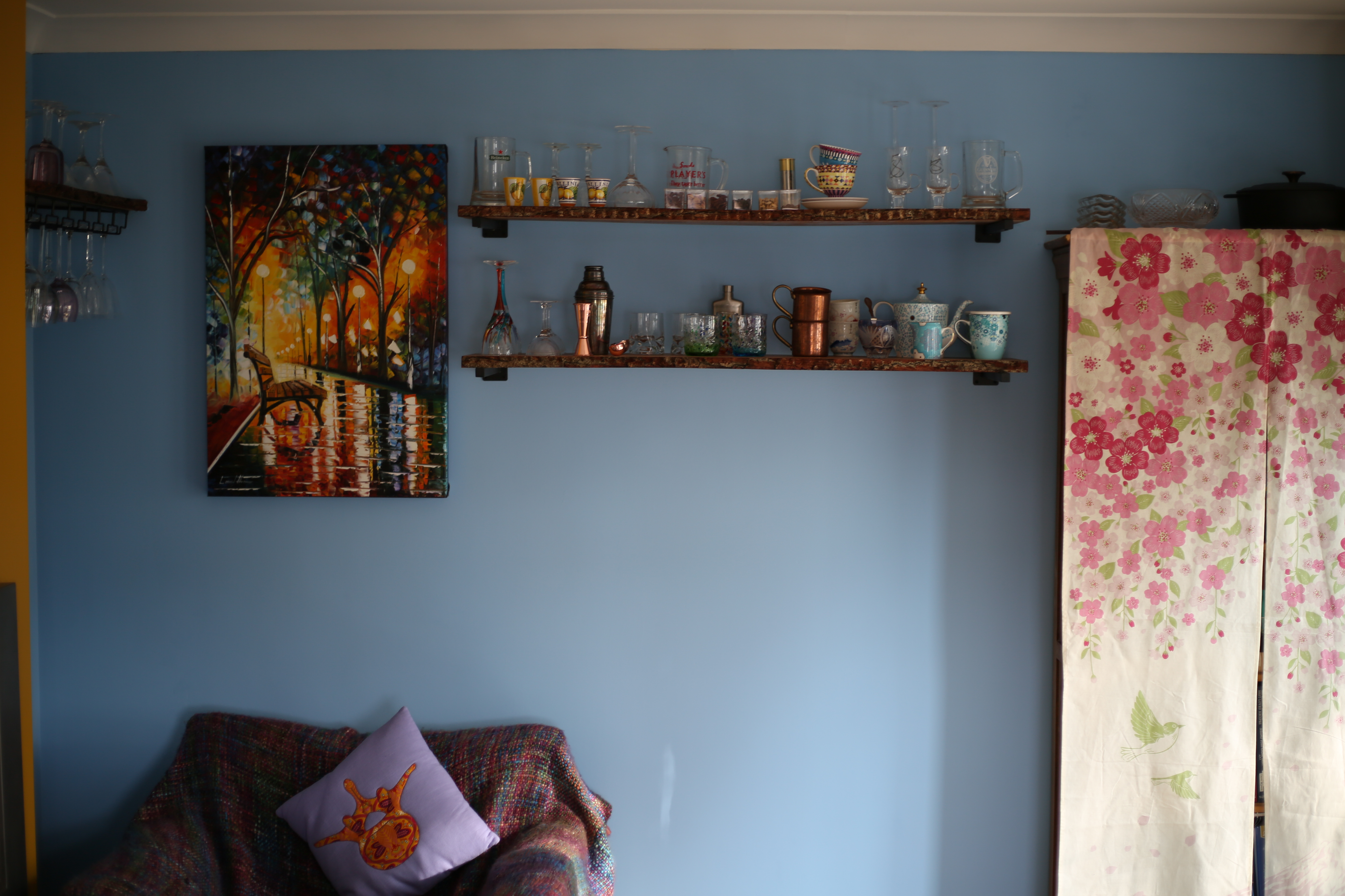 At the same time as buying the larger shelves, I bought wood for two smaller shelves to fit in the alcove below the wine glass rack. It was always my intention to fit more storage in that area, but getting round to it was another matter. Rather than using floating brackets, for the next shelves I’ll use battens around the three sides which will provide a sturdy base.