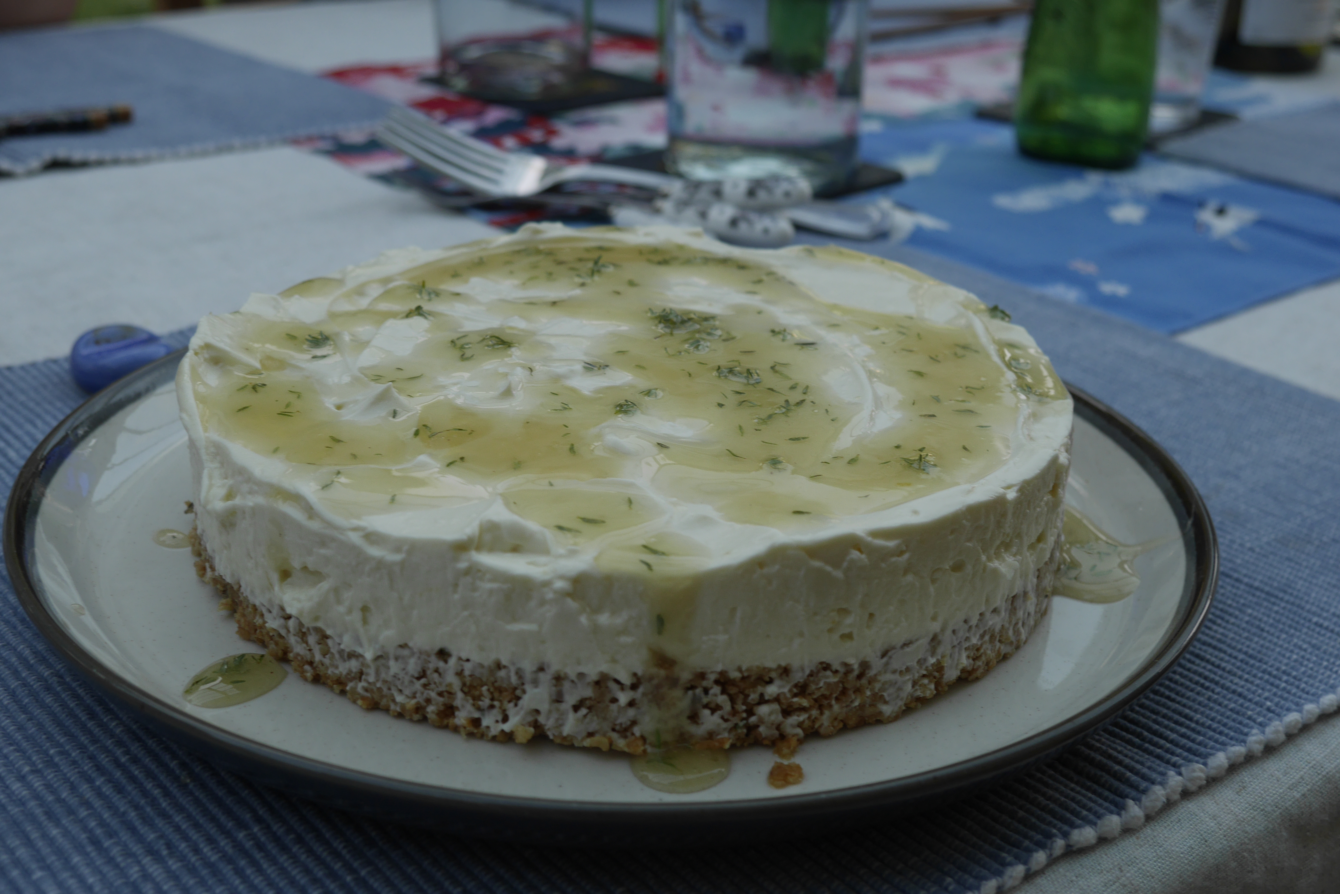 Part of entertaining is necessarily cooking (traditionally speaking, of course) and since I was making my oft requested Korean fried chicken, I wanted to do something a little different for dessert. I had a friend recommend a recipe from Yotam Ottolenghi’s “Simple” (a somewhat ironic title given the complexity of some of his recipes!) but on this occasion it was genuinely manageable. A yoghurt and white chocolate cheesecake topped with thyme-infused honey. I was a little skeptical of the herbal element although it was an excuse to use some fresh thyme from the garden. The base was made from crushed Hobnobs with a tablespoon of fresh thyme leaves in the mix, bound with melted butter. It was a hit, and got even better after a couple of days.