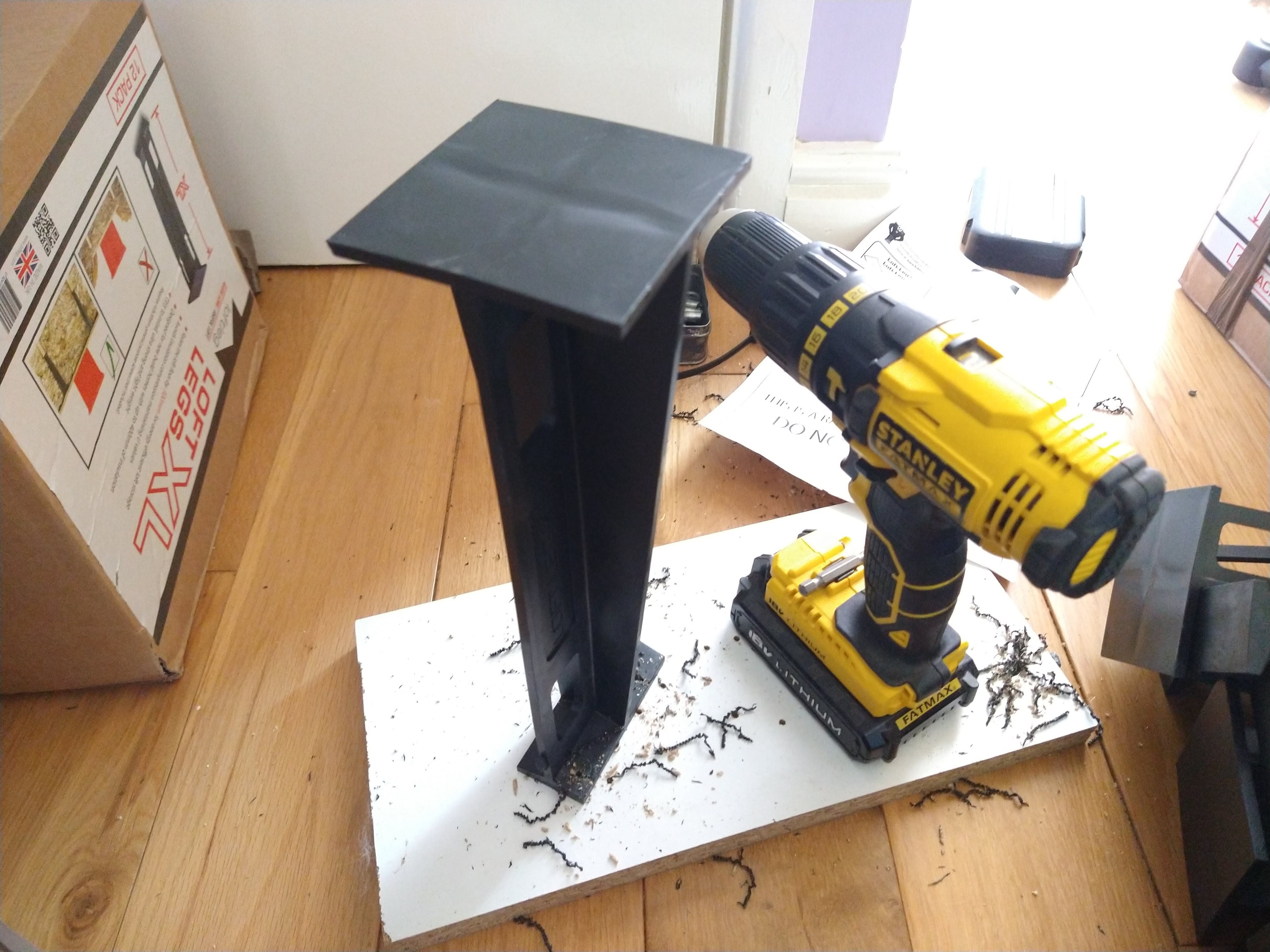 Only after I started did I realise how much preparation I had forgotten from last time. At least part of that was an excuse for procrastination, but some of it did make sense. The Loftleg stilts come without pre-drilled holes and drilling them in the tight confines of the loft wasn’t going to be a good solution. I remembered to pre-drill holes this morning, but as soon as I set the first leg in place I realised something else. Last time I pre-drilled and also loosely placed a screw in each hole. This made the process a lot less fiddly so I reverted back to the pre-screw method after struggling with the first legs.