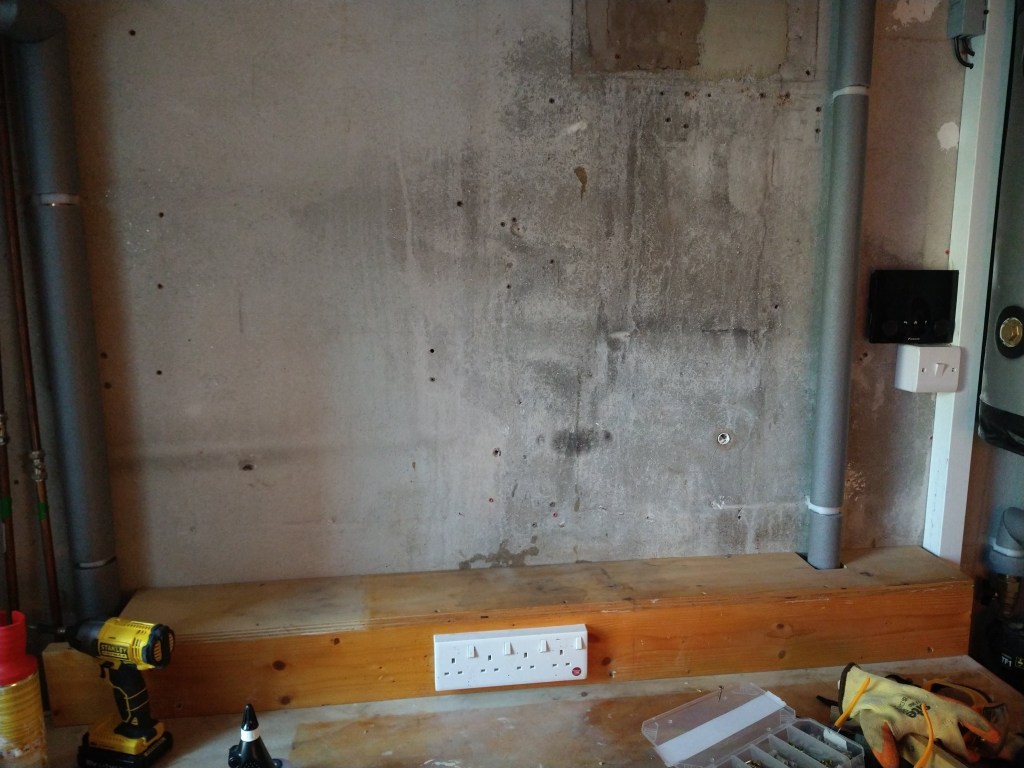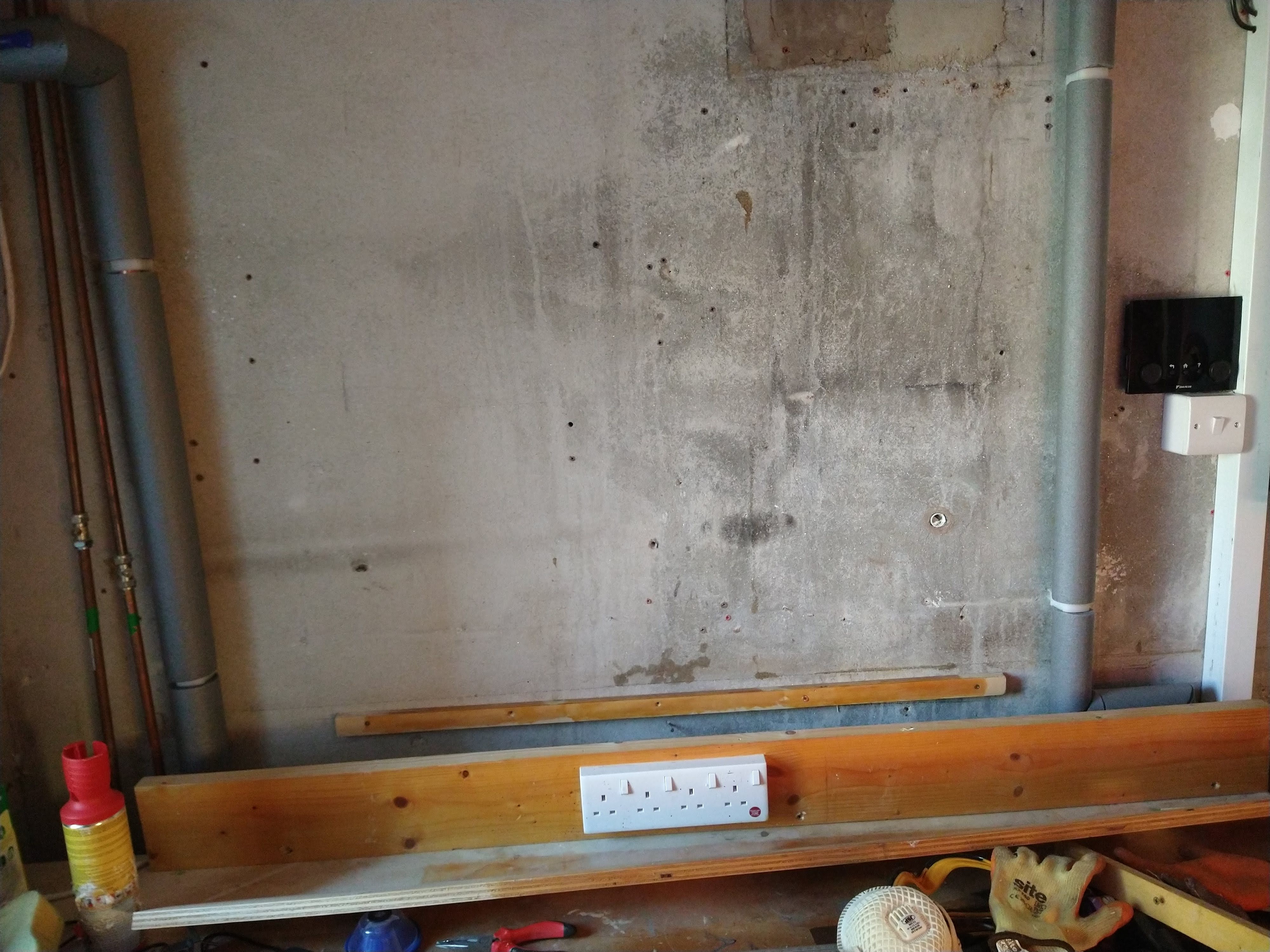 With the aid of a Japanese saw I cut the cover in two then reinforced it at the rear edge. Then I screwed down the left hand side, allowing the right side to be opened and closed as necessary. The next step is putting up some shelves and a backboard for tools, working around the new heat pump plumbing.