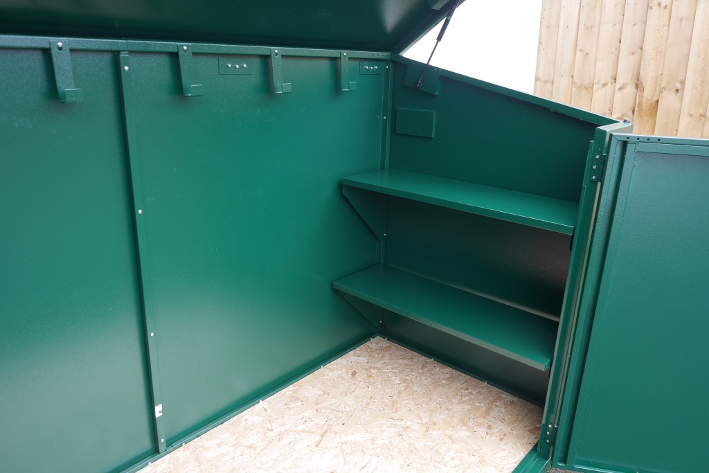 Once I found a suitable assistant, we were able to get most of the structure assembled that first evening, then finished it off the following day. We also bought the additional shelves and hooks to make the inside space a bit more functional. The advantage of this particular model (the Access e-plus) is mounting points for electrical sockets so that bikes can be charged without hauling them back inside. My plan is to run some armoured cable out to the box and fit an outdoor socket when I get a chance.