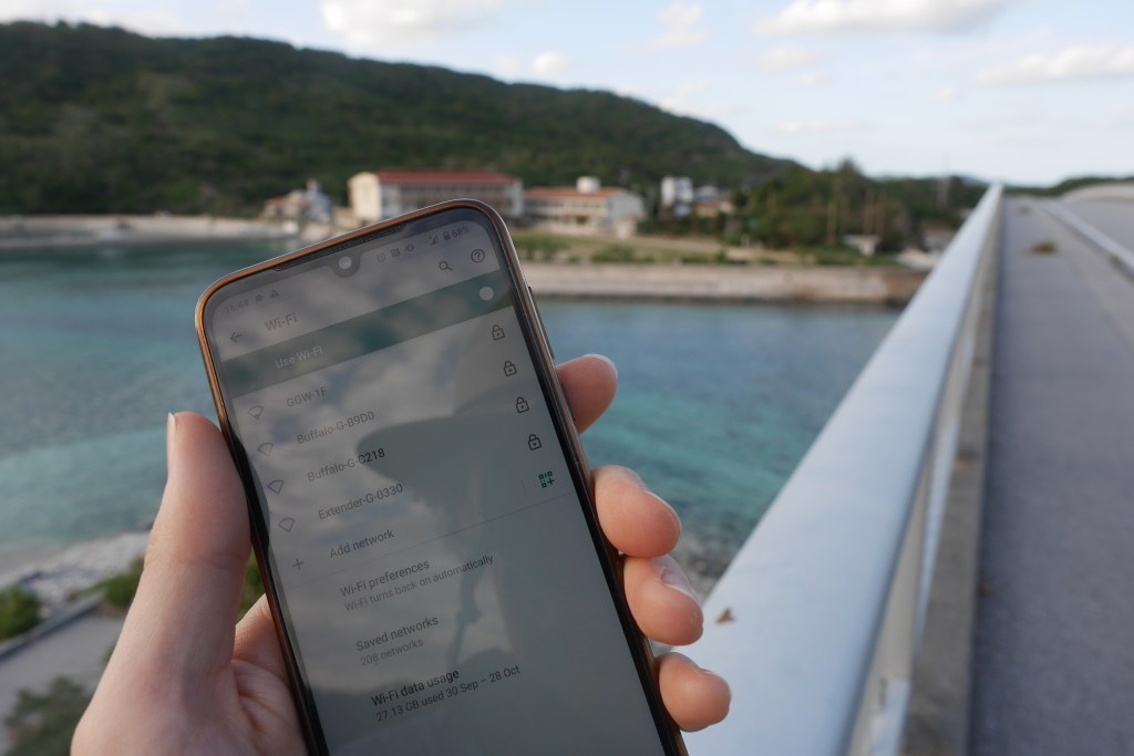 As part of an experiment to see how far WiFi extended along the islands, I took out my phone and was able to see a bunch of networks at the far end of the bridge to Fukaji. Even in this paradise you can still see at least four networks. It’s the clash between Japan’s desire to preserve the surrounding environment and the relentless march of technology. But hey, if I can have 70 Mbps internet and sit on a beach with white coral sands in the middle of nowhere, sign me up.