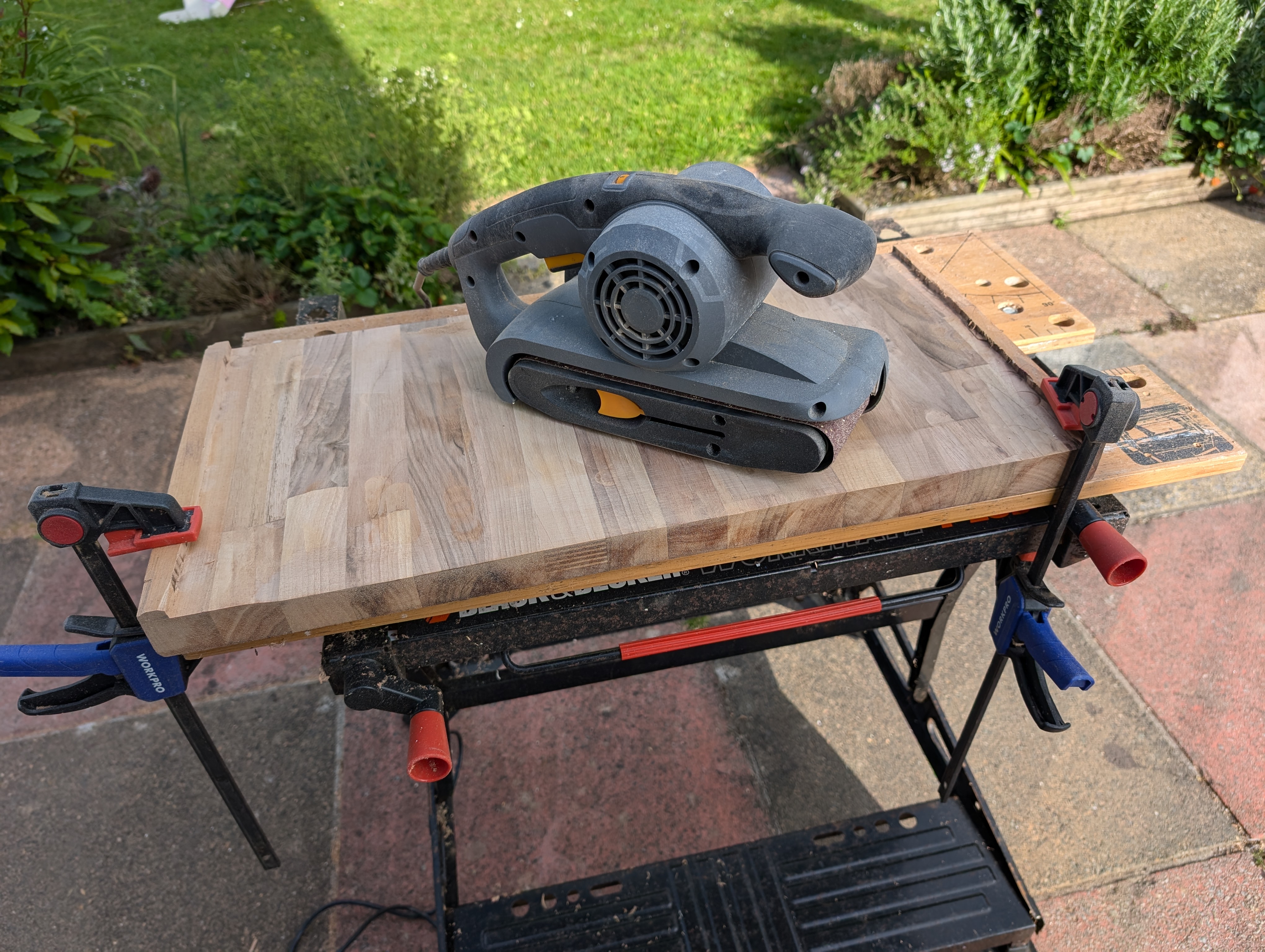 How should one go about this? Glue some strips of wood at either end to lift it above the height of the hob? Or spend an excessive amount of time and effort using a router to cut channels out to get to the desired depth? You can guess which one I picked. As a result, I started the project and ran out of time. I finally picked it up again over the weekend, routed out the last little bit, then used the belt sander to level off the surface. I finished the job with a little hand sanding close to the edges.